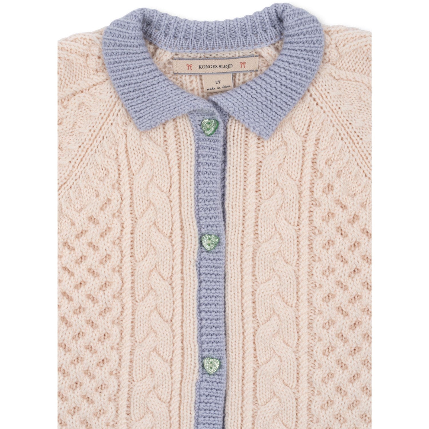 Oppdag den sjarmerende Konges Sløjd Emma Cardigan i off white, perfekt for alle små. Denne cardiganen er nøye laget i 100% myk merinoull og fremhever et elegant kabelstrikket mønster. Med sine hjerteformede knapper og klassisk krage, kombinerer denne genseren stil med komfort. Ribbekantene sikrer en god passform, samtidig som den holder barnet varmt på kjøligere dager. En ideell følgesvenn for enhver anledning - både til hverdags og til fest.