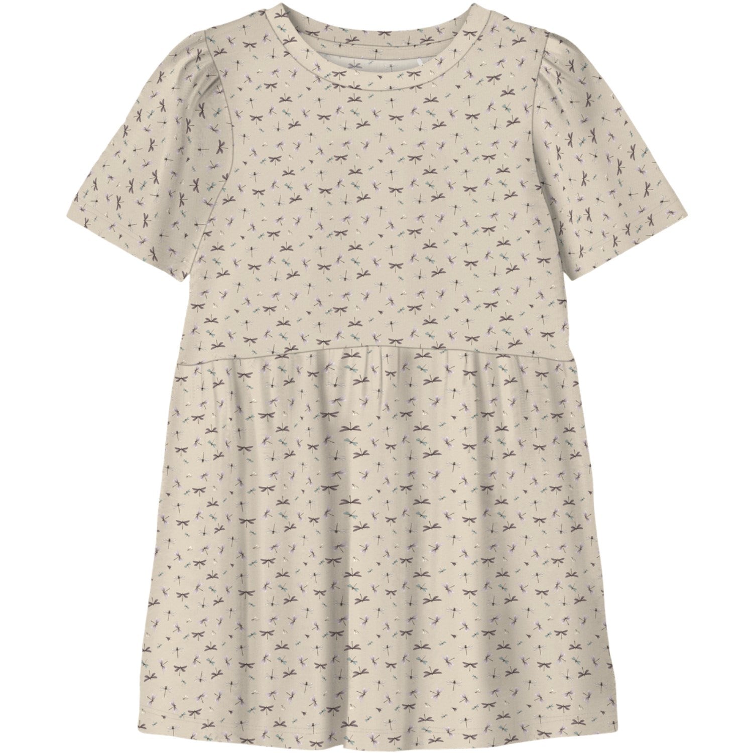Kjolen er designet med en klassisk rund hals og korte puffermer som tilfører en søt, leken vri på den tradisjonelle silhuetten. Den repeterende printen over hele kjolen legger til en ekstra dimensjon av stil, mens den normale passformen sørger for at den er like behagelig å ha på som den er stilig.