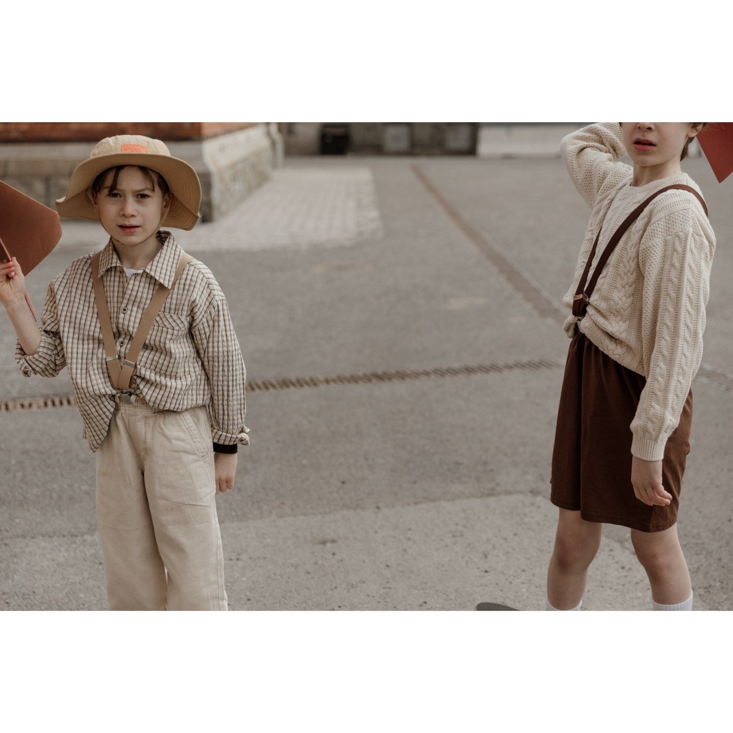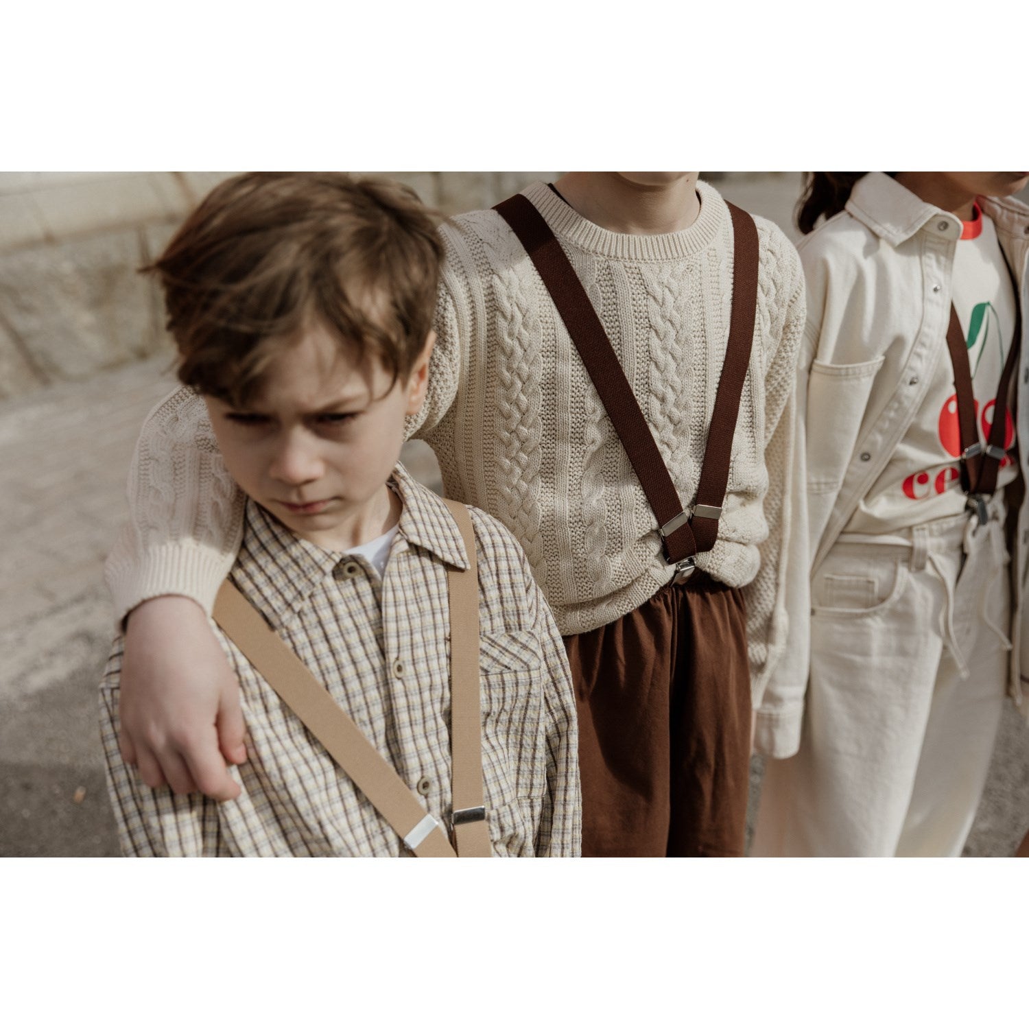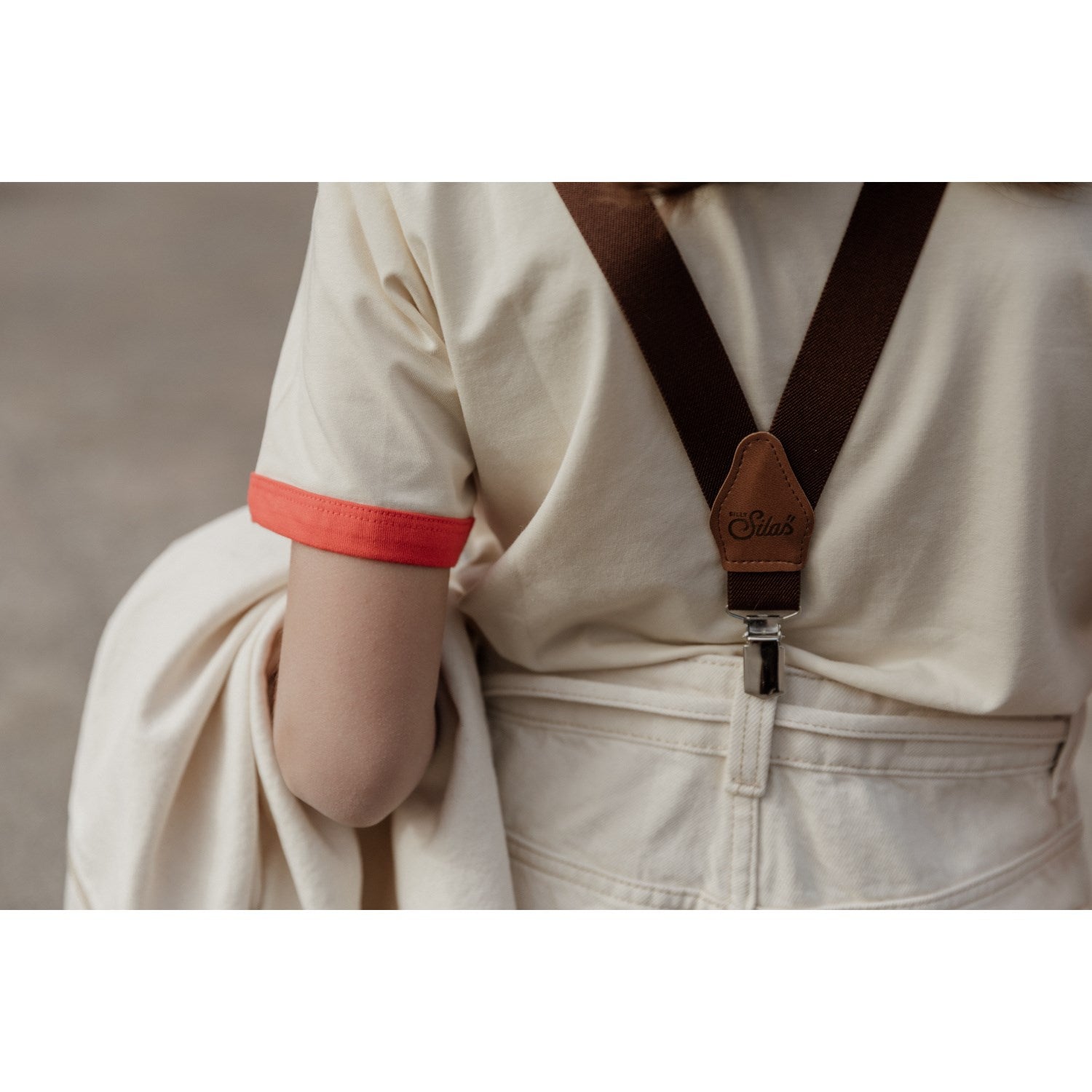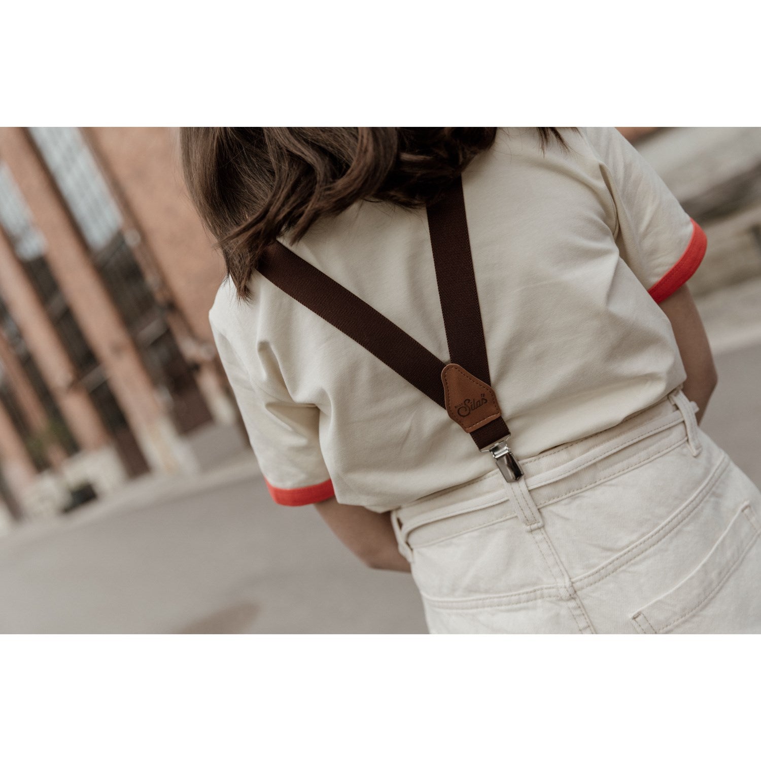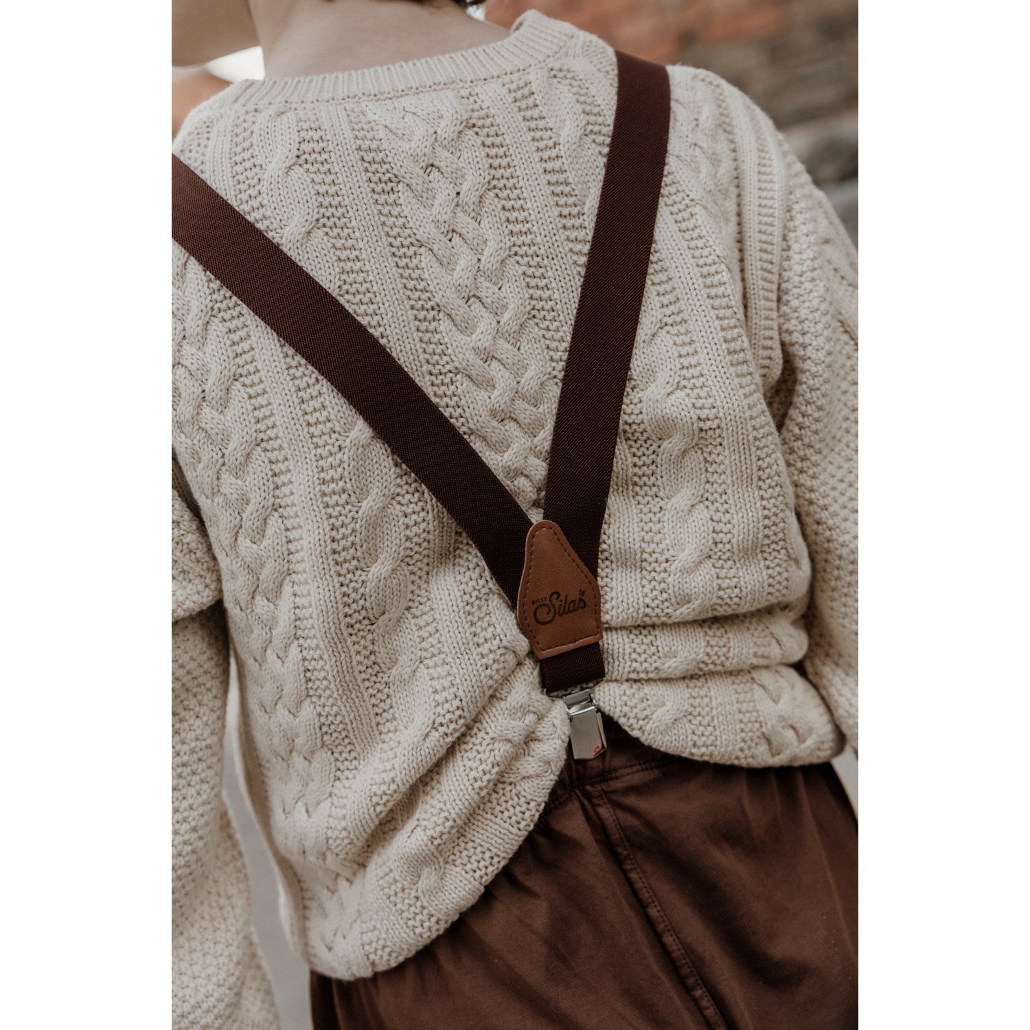Oppdag de sjarmerende Silly Silas barnebuksene med bukseseler i sjokoladebrun farge som kombinerer stil og bekvemmelighet. Disse buksene er produsert i mykt materiale som garanterer komfort, designet med justerbare seler for en perfekt passform. Ideell for lek og hverdagsbruk, og kan enkelt vaskes.