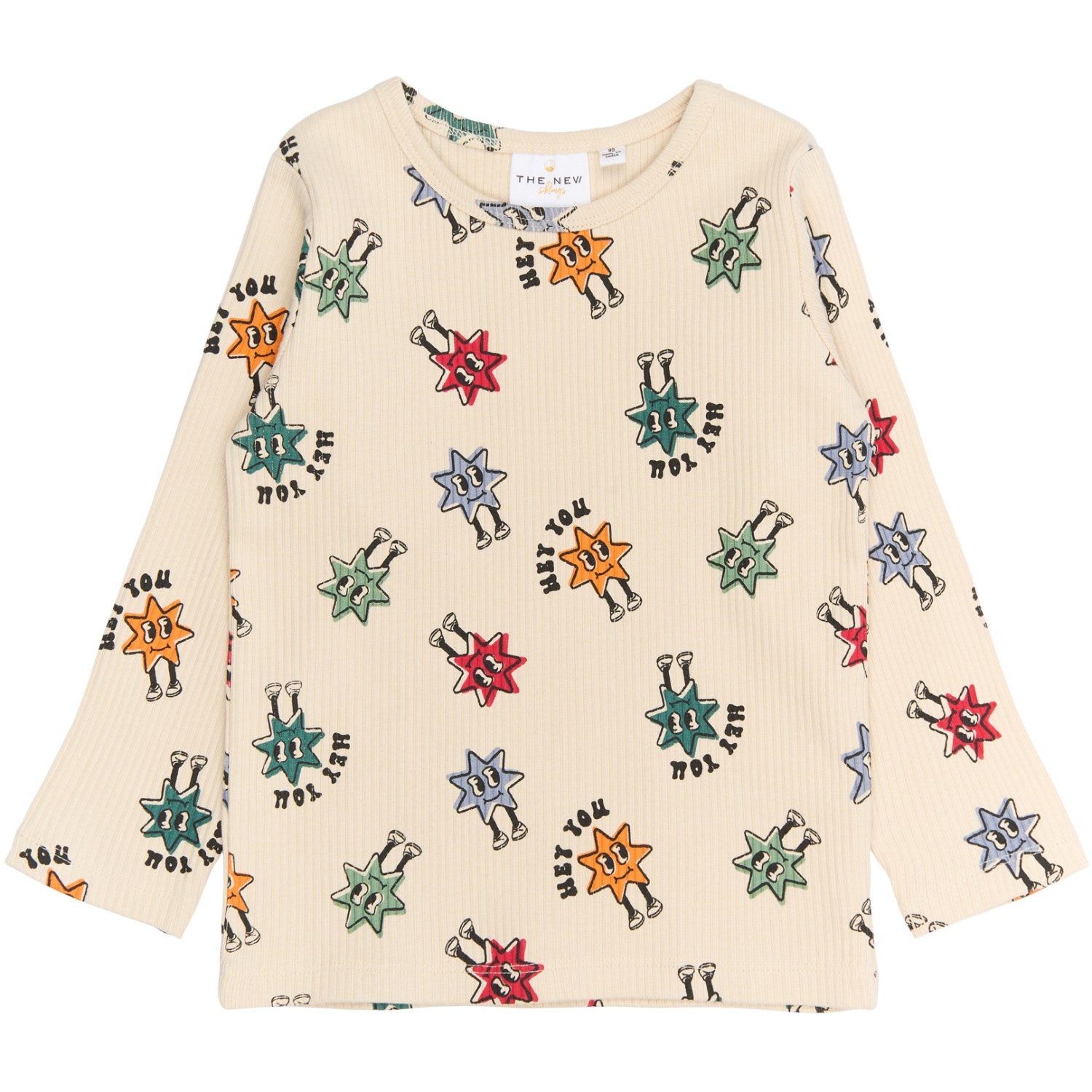 Oppdag gleden av hverdagsantrekk med THE NEW Siblings' Gardenia AOP Raul L_S Rib Tee for barn. Denne sjarmerende genseren er skapt for å tilby maksimal komfort og stil med sitt myke, elastiske ribbestrikkede materiale. Dens fargerike og heldekkende trykk av stjerner og den lekne teksten "Hey you" tilfører et friskt pust til barnets garderobe. Med en tettsittende passform og rund hals, garanterer denne genseren både bevegelsesfrihet og behagelig passform gjennom hele dagen.