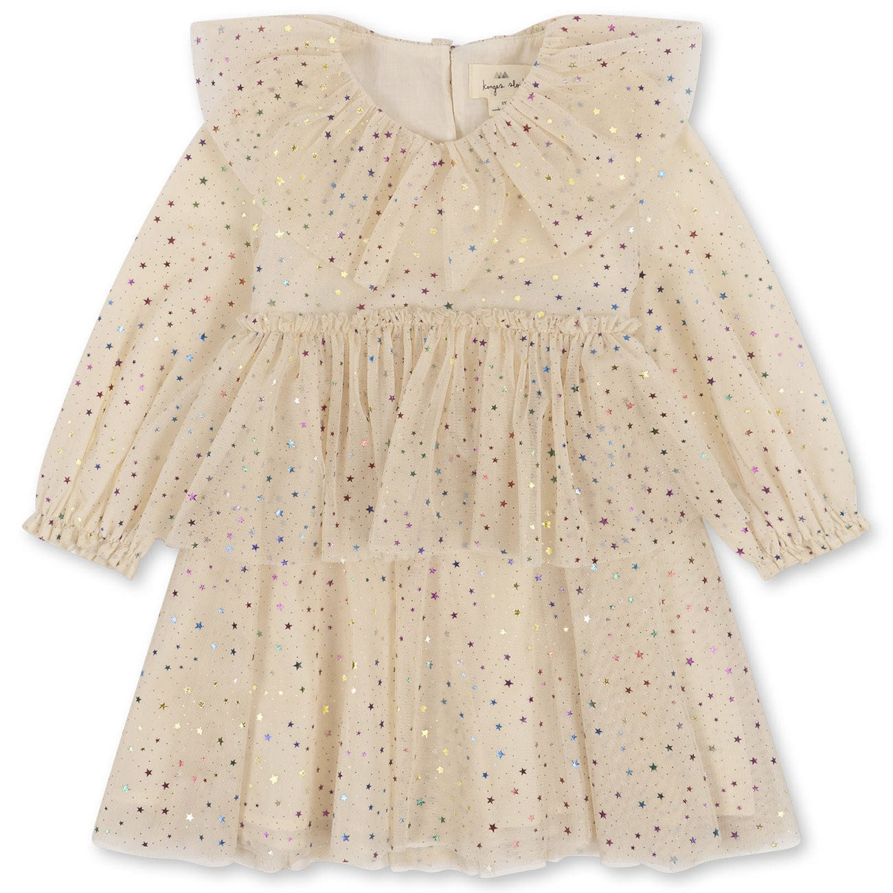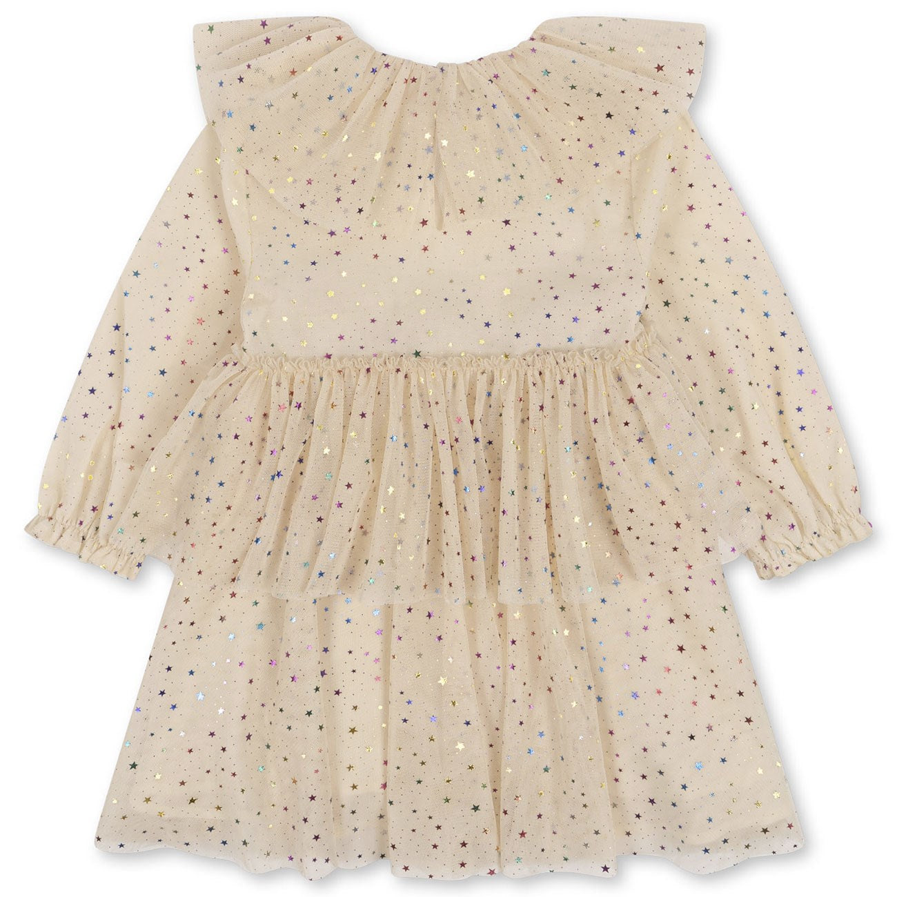 Lagdelt tyllkjole med dekorativt foliestjernetrykk og en stor krage. Har elastiske rufsete mansjetter og en enslig perlemorknapp i ryggen.