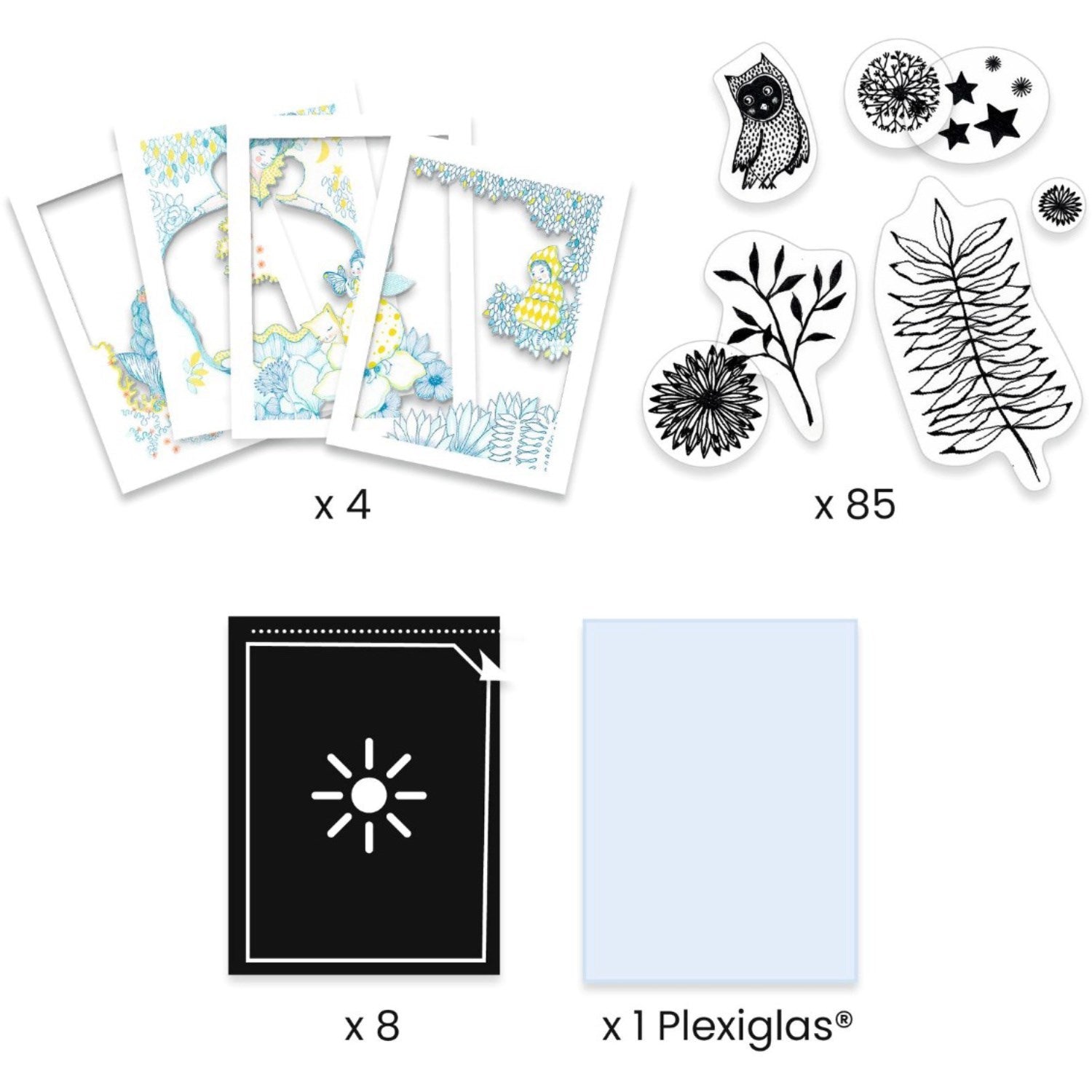 • Boksen inneholder: fotopapir, forskjellige sjablonger med motiver for å bygge ditt eget motiv og en vakker ramme for kunstverket ditt