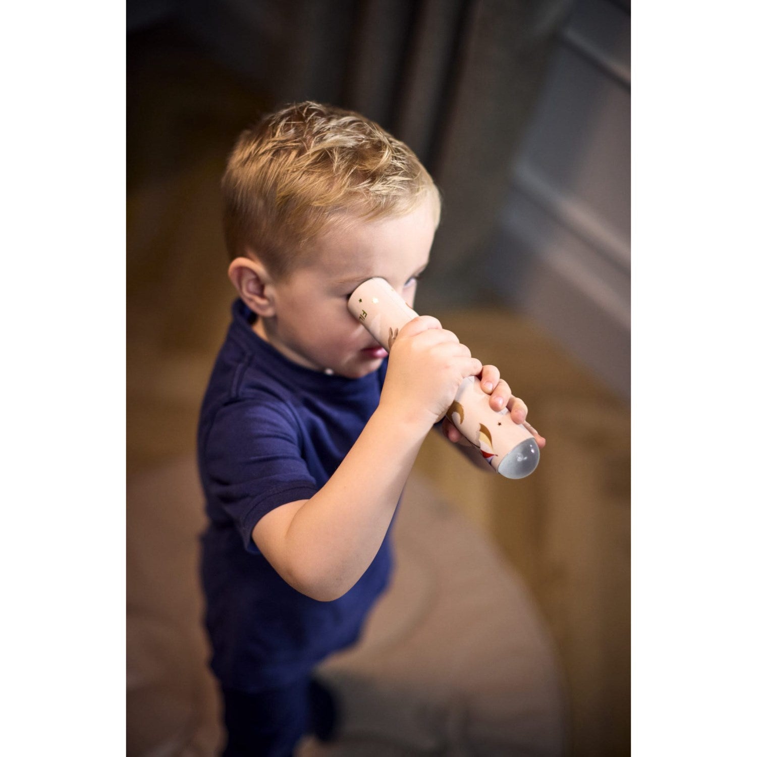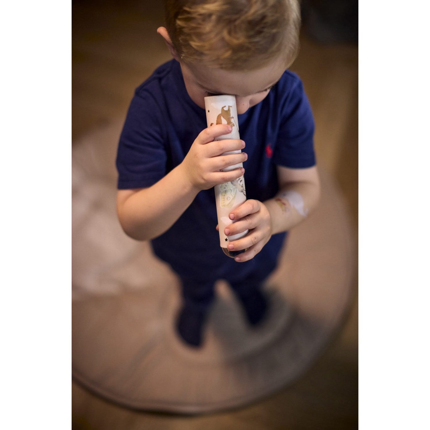Den utmerker seg med sitt robuste design som gjør det trygt for små hender, samtidig som det tiltrekker seg oppmerksomheten med sine glitrende gullfoliedetaljer. Kaleidoskopet er tilpasset barn fra 3 år, og er spesialdesignet for å være lett å bruke, lett å bære med seg, og enkelt å lagre.