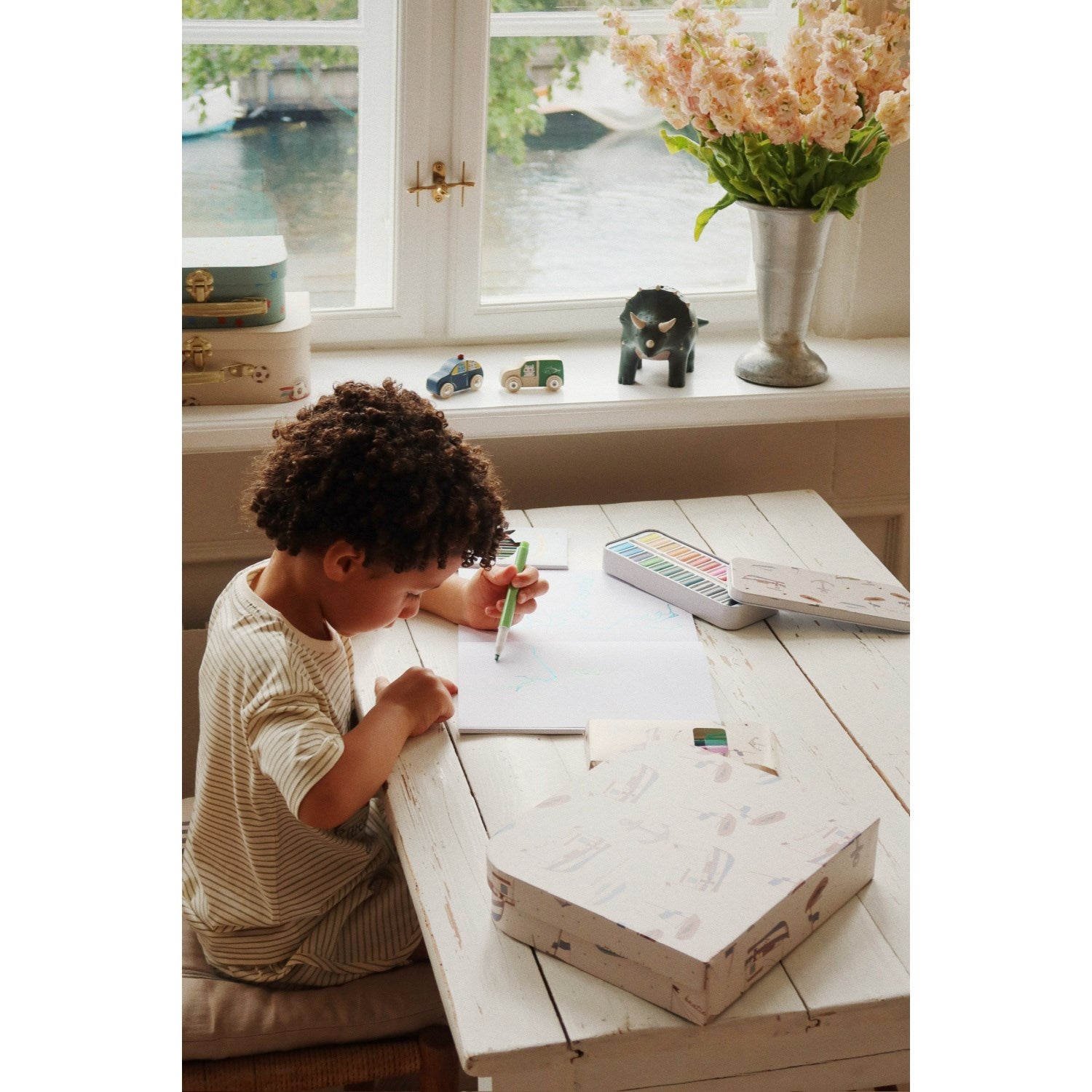- Inneholder: 12 fargestifter, 6 tusjer, 6 oljestifter, 2 ark klistremerker, 1 notatbok