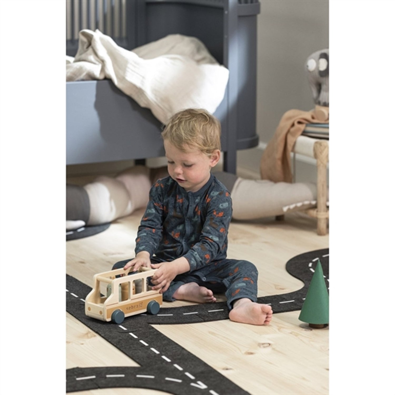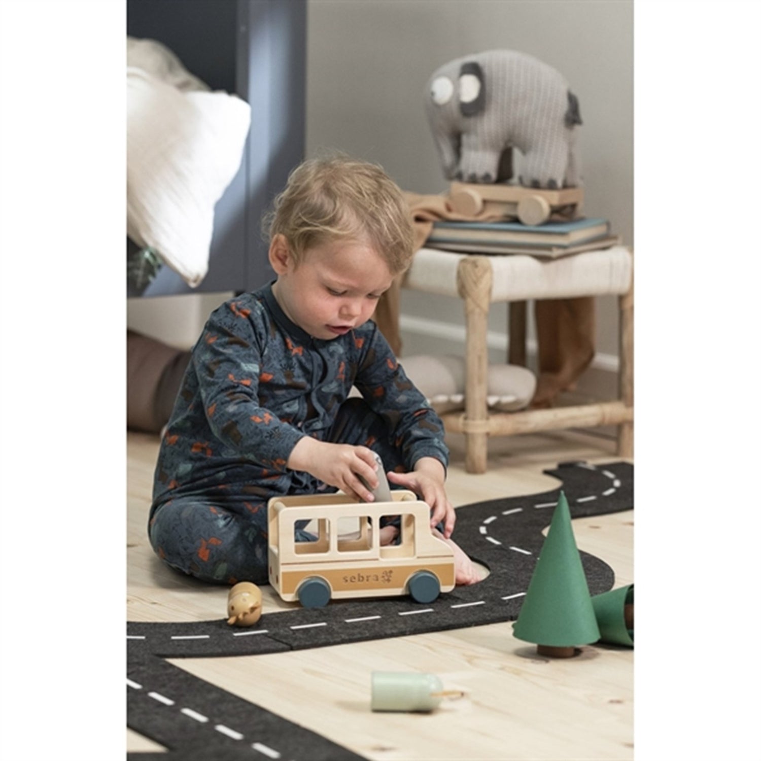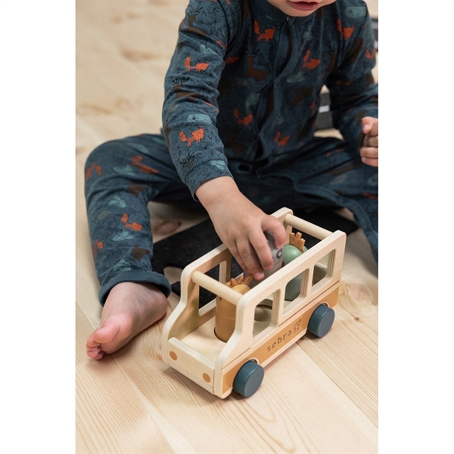 Bussen og de tre passasjerene er laget av tre og malt i douche-farger. Sjiraffen, tukanen og dovendyret fra Wildlife-temaet sitter løst på hver sin plass og kan enkelt byttes rundt mens barnet trener opp finmotorikken ved å flytte dem inn og ut av bussen. Som en ekstra detalj har sjiraffen ører og tukanen har stive hodefjær laget av filt. De tre figurene passer også til Sebras lekefly. Lekebussen er 20 cm lang og er perfekt å krype rundt med når Wildlife-dyrene skal på tur. Den åpne designen er lett for små hender å ta tak i, og hjulene spinner lett slik at bussen kan akselerere under lek. Den ferdige lekebussen er designet i Danmark, og er en perfekt dåps- eller bursdagsgave som kan vare til mange søsken og generasjoner.
