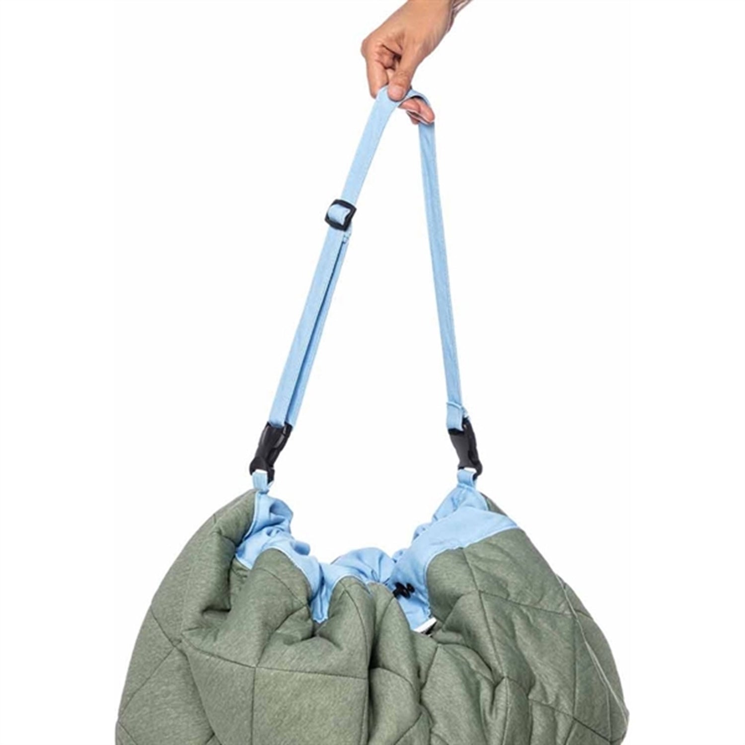 - Kan brukes som lekematte, oppbevaringspose og veske som kan henges på barnevognen