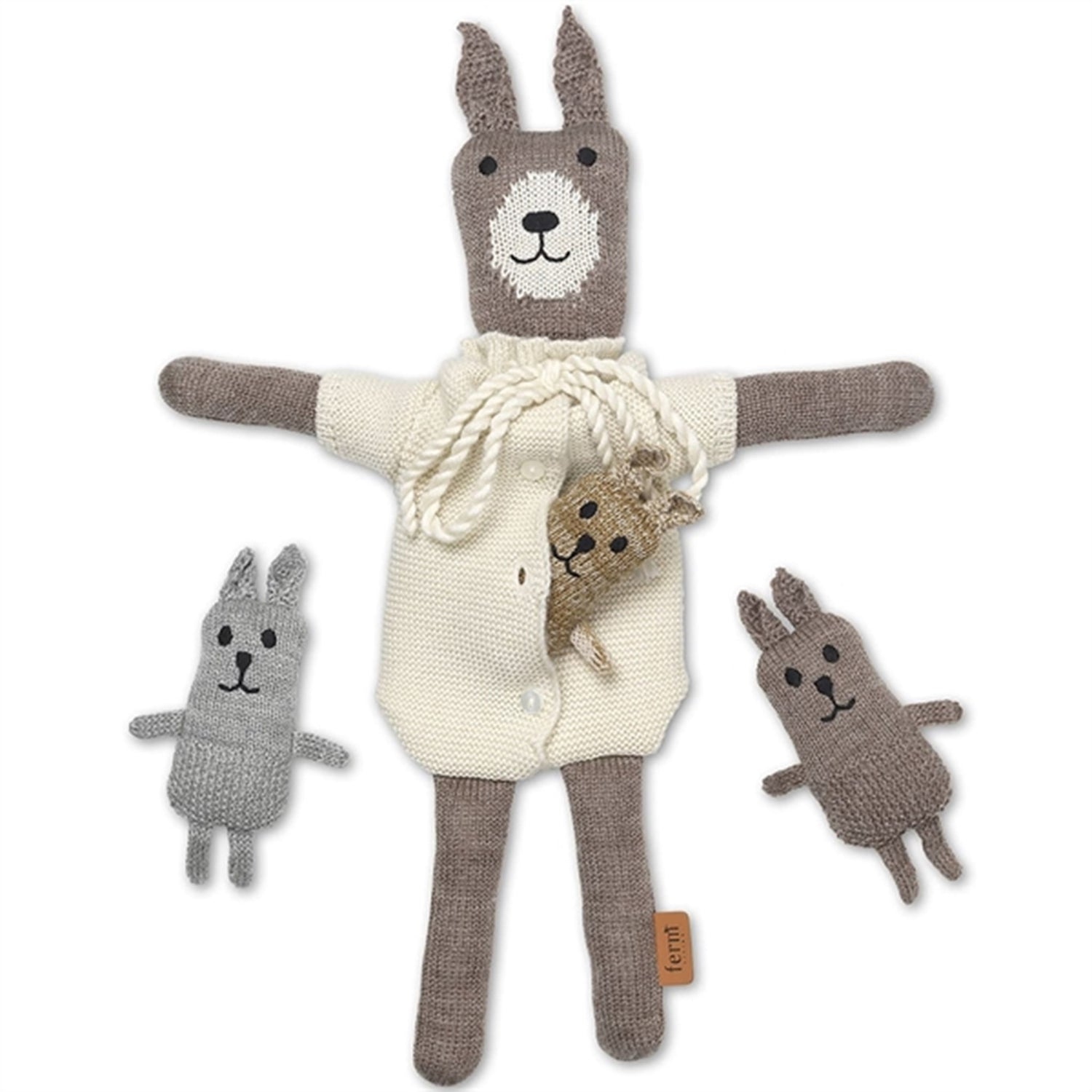 Ferm Living Lee Merino Kanin Familie Sugar Kelp Melange/Off-White er perfekte for småbarn med sin myke merinoull og sikkerhetsgodkjente design. Disse bamsekaninene stimulerer læring og kreativ lek, egnet fra fødselen. Lett å bære og rengjøre, de blir raskt et kjært kosedyr i ethvert hjem.