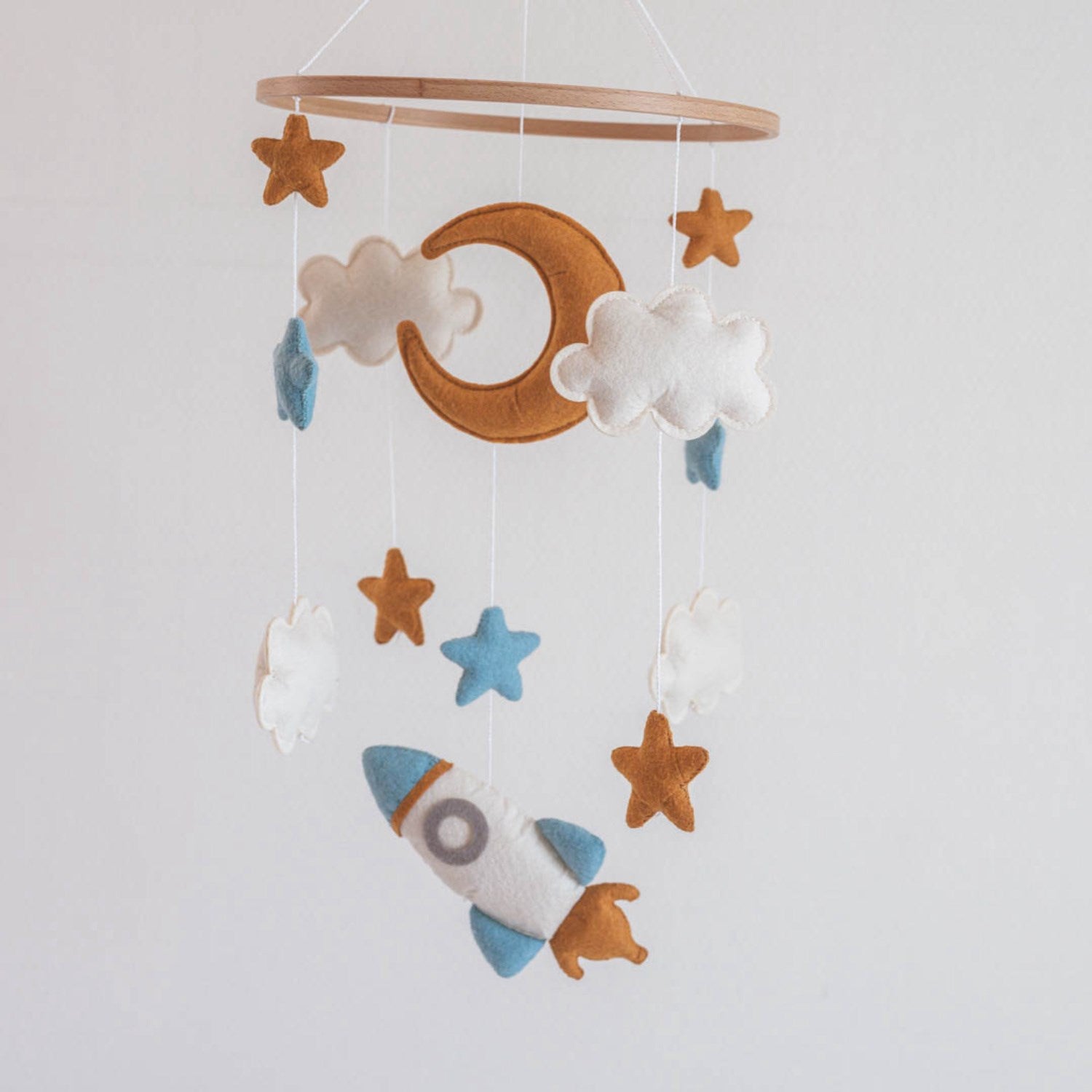 Oppdag den sjarmerende "That's Mine Rocket Blace Mobil", perfekt for å berike ethvert barnerom med sitt drømmende design. Dette mobilet er håndlaget av 100 % polyesterfilt, og de forsiktig sammenbundne trådene forhindrer floker, slik at du enkelt kan tilpasse det til rommet. Et mesterstykke både til dekorasjon og lek, det stimulerer barnets visuelle sanser og fantasi. Lett å vedlikeholde og perfekt egnet for daglig bruk.