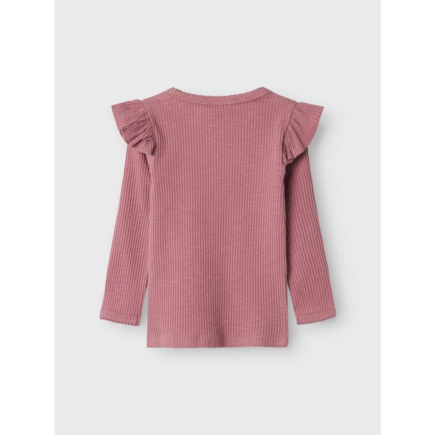 Toppens design inkluderer en klassisk rund hals og lange ermer, supplert med sjarmerende frills og en diskret merkeetikett som legger til et stilig preg. Den slim fit-passformen sørger for en moderne silhuett som sitter pent på kroppen, noe som gjør denne genseren til et flott valg for både skole og fritid.