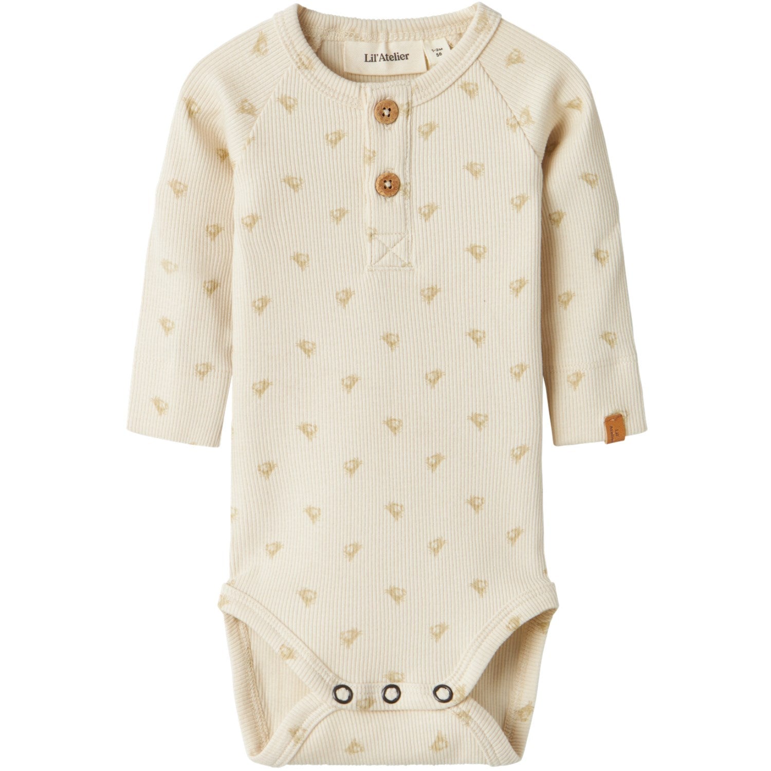 Designet framstår som både moderne og praktisk med lange ermer og en klassisk rund hals. For enkel klesbytte har bodysuiten både knappelukking og trykknapplukking, som gjør påkledningen lekende lett. Hele overflaten prydes av et sjarmerende, gjentakende mønster som legger til et lekent preg.