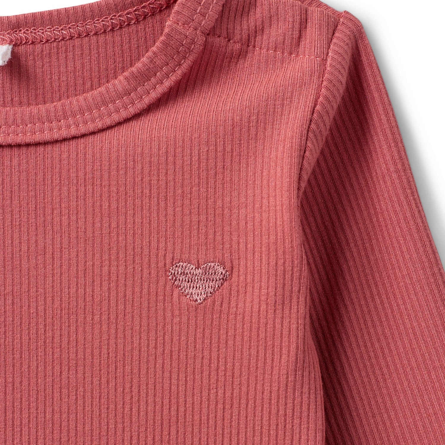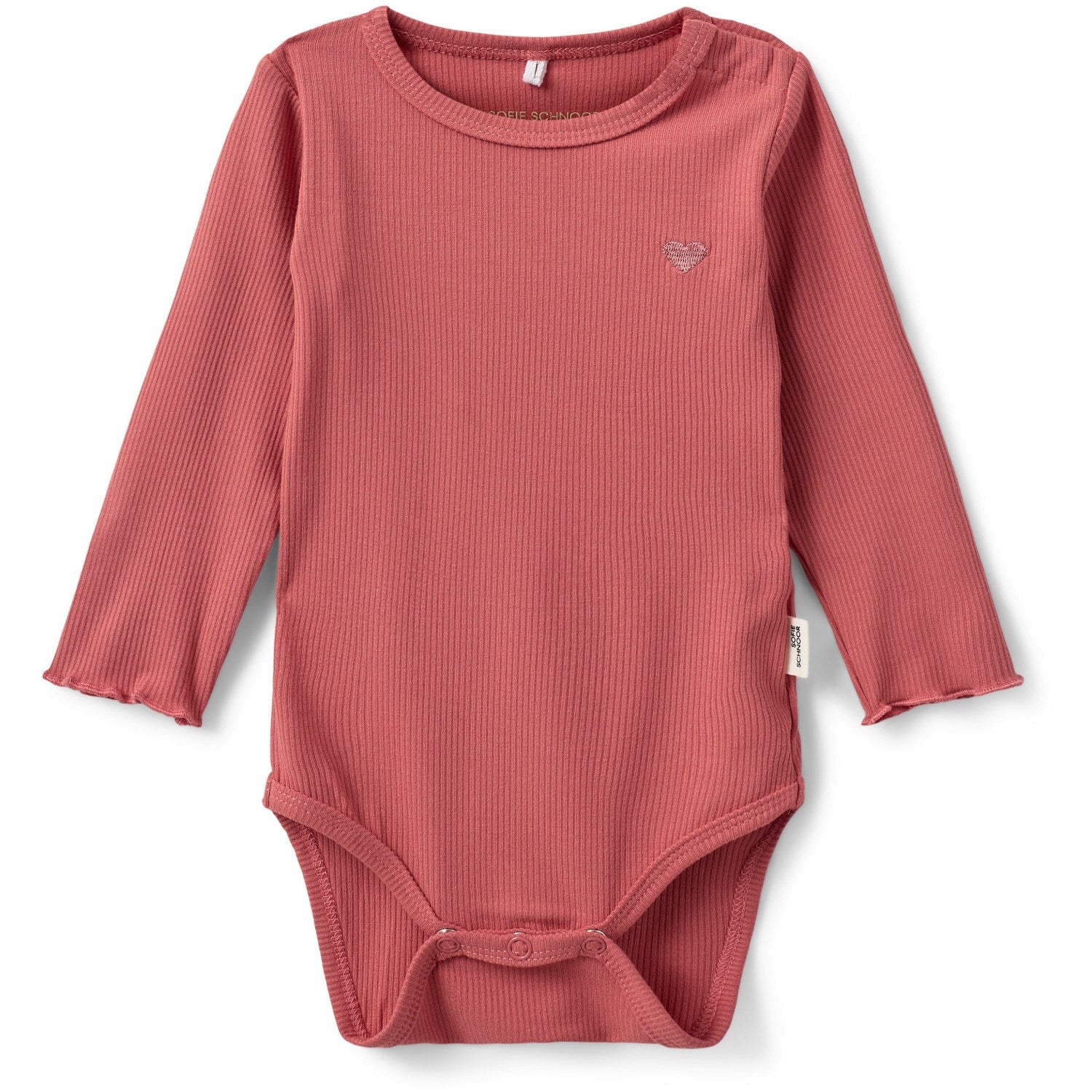 Denne sjarmerende bodyen fra Sofie Schnoor i korallfarget rosa er både søt og praktisk. Laget av mykt, ribbestrikket materiale som er behagelig mot barnets hud. Designet avsluttes med elegante volanger på ermene og praktiske trykknapper som gjør det enkelt å skifte. Perfekt til hverdags eller en spesiell anledning der barnet ditt trenger å se ekstra søtt ut.