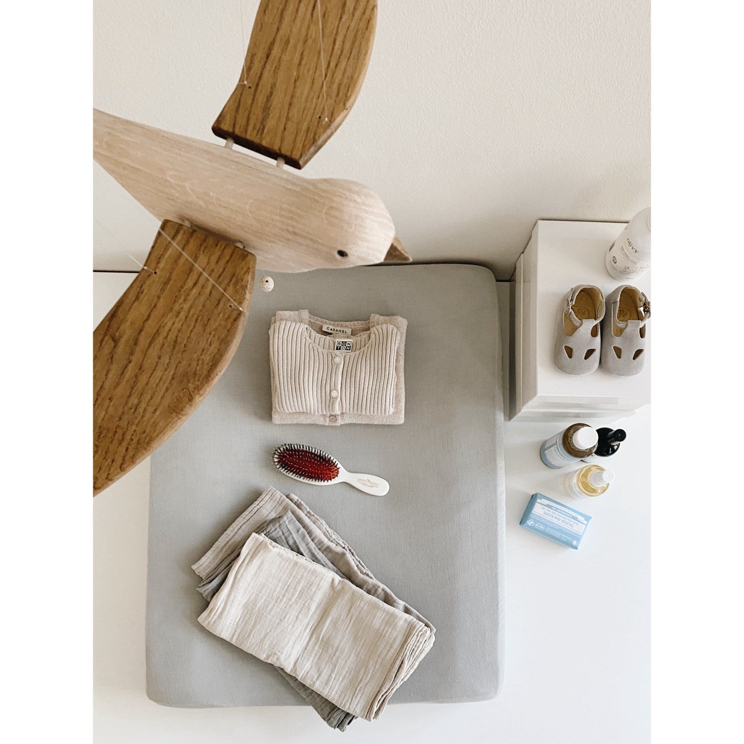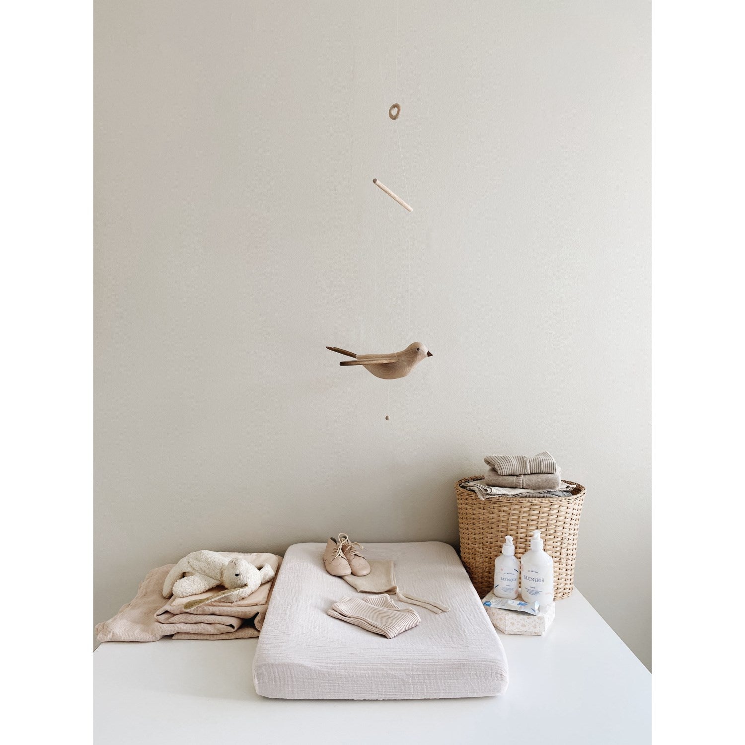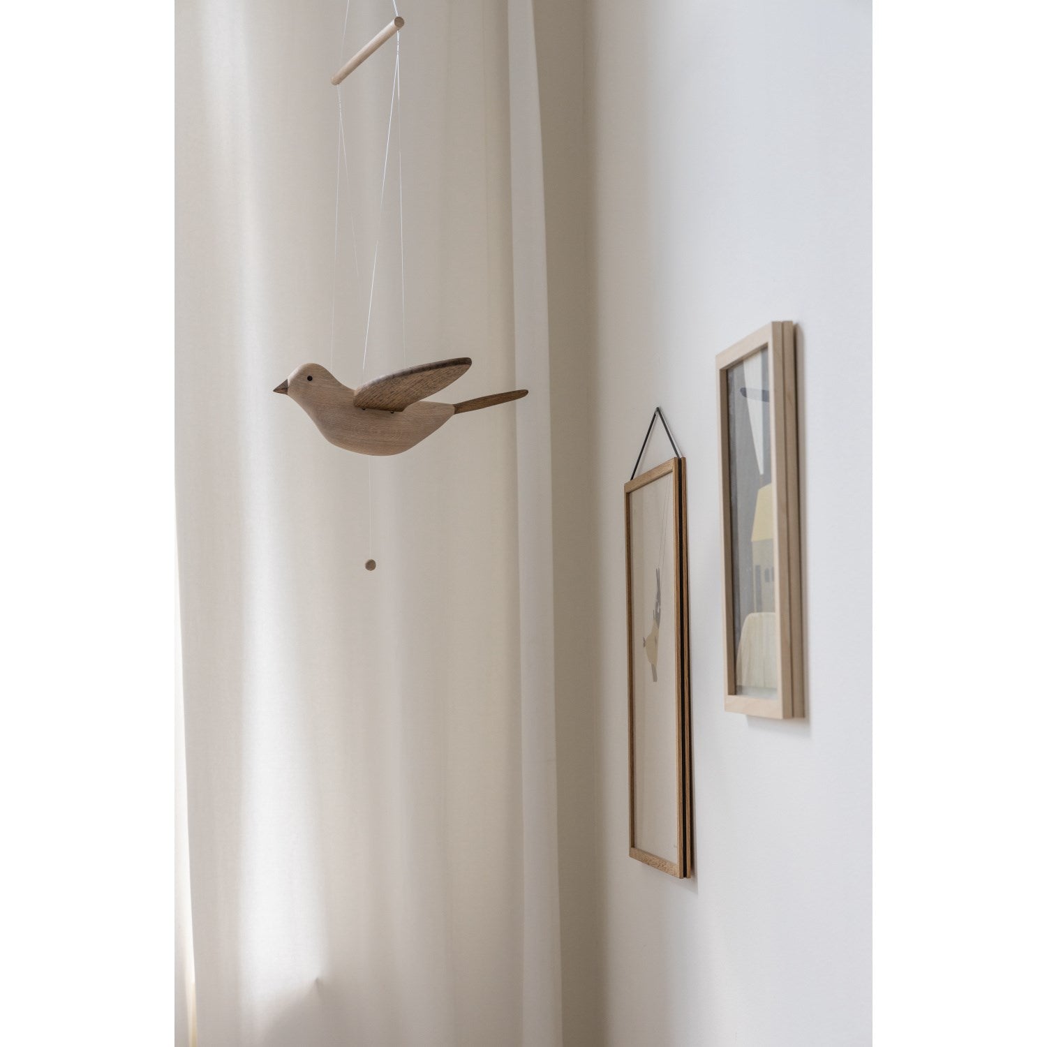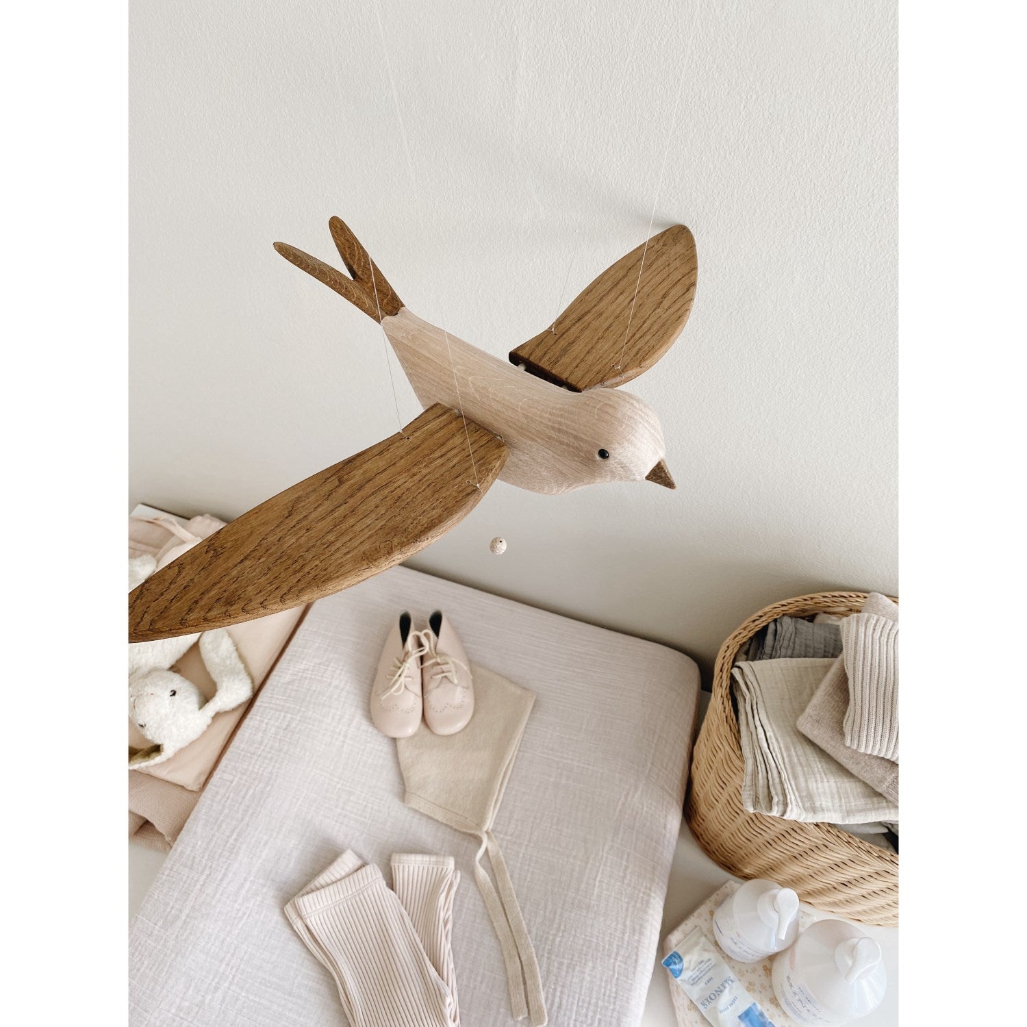 Laget av naturlige materialer og med sitt myke, avrundede design, tilbyr Koko en trygg og lærerik opplevelse. Dette gjør den både sikker og enkel å integrere i barnerommet, og den enkle vedlikeholdsstrukturen sørger for langvarig bruk uten bekymringer. Siden mobilen kun er til pynt, er den designet for å henges utilgjengelig for små barnehender, slik at du kan føle deg trygg på barnets sikkerhet.