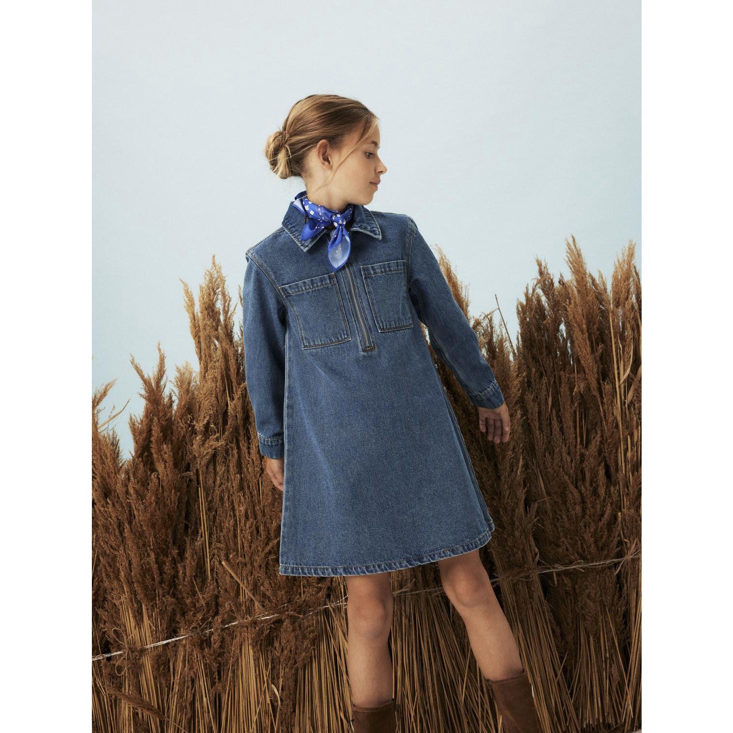Gi barnets kleskolleksjon en frisk pust med denne sjarmerende Name It Medium Blue Denim Astrid Zip Denim Kjole, designet for å være både stilig og komfortabel gjennom alle årstider. Denne kjolen er laget av slitesterkt denimstoff, som ikke bare sikrer langvarig bruk, men også gir et unikt og tiltalende utseende takket være subtile skrubbsårfinish.