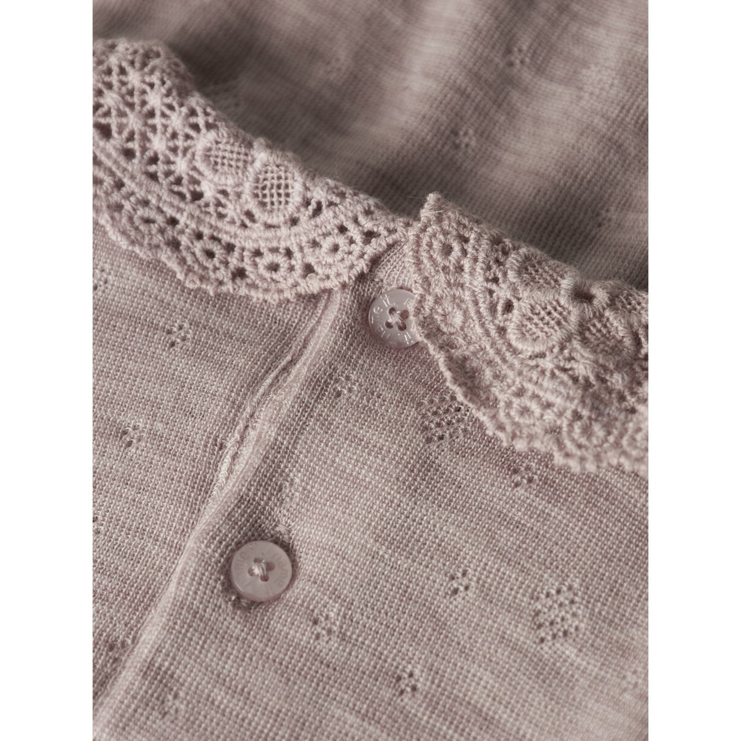 Designet med en sjarmerende rund hals og lange ermer for optimal varme, har denne bodysuiten unike needle drop-mønstre som gir et lekent og søtt utseende. Fargevalget i beroligende grått komplementeres av delikate blondedetaljer, noe som skaper et elegant og tidløst design.