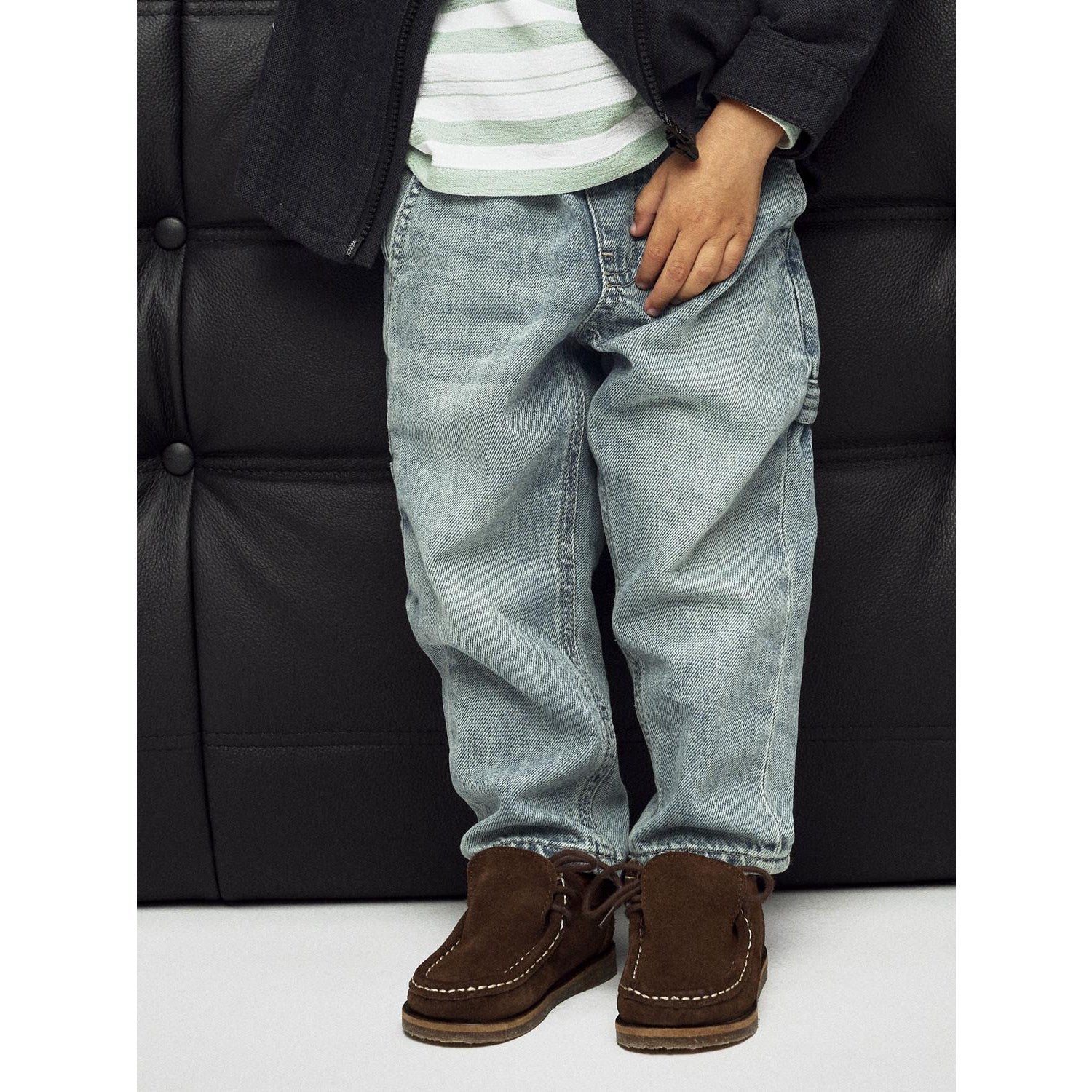 Jeansen kommer i en tiltalende medium blåfarge, med kraftige skrubbsår for et unikt preg. Tapered fit sikrer en moderne silhuett, hvor jeansene er løsere rundt hoftene og smalner av nedover bena. Praktiske detaljer inkluderer justerbar midje for optimal passform, press-stud og en halv falsk glidelås, som gjør dem enkle å ta av og på. Baklommer og frontlommer tilbyr praktisk oppbevaring for små skatter barnet måtte finne på eventyr.
