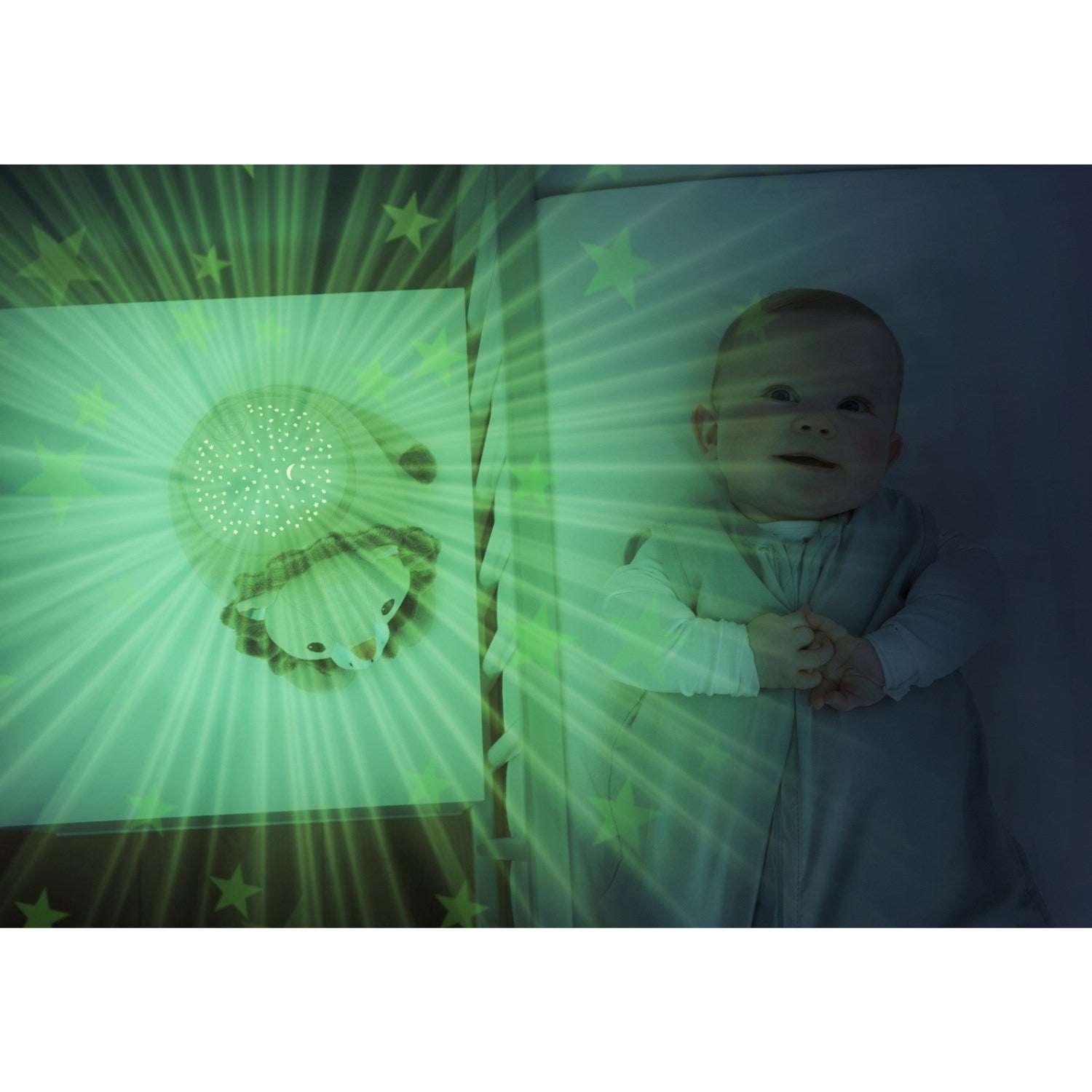 - Projicerer magiske stjerner på loftet i fire forskellige farver: orange, blå, grøn eller flerfarvet.