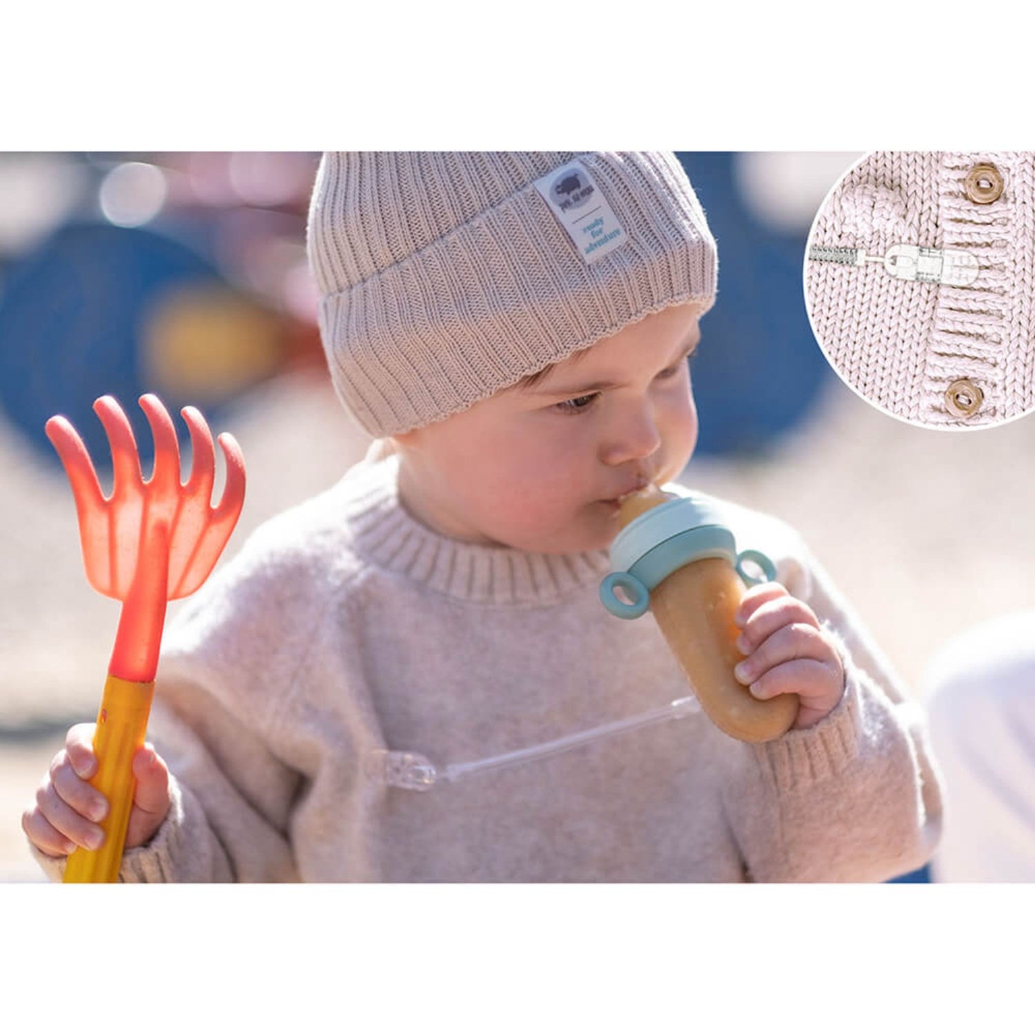 - En allsidig fruktspene med et fleksibelt design som lar barna trygt utforske smaker