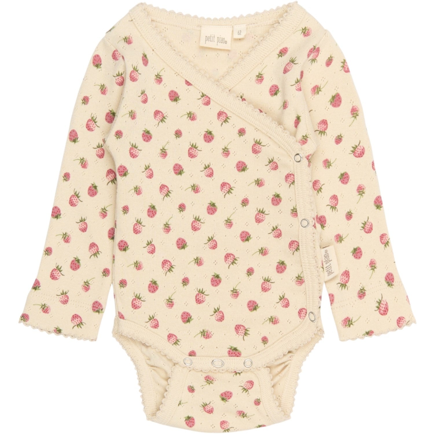 Kle din lille skatt i denne sjarmerende langermede bodysuiten fra Petit Piao. Med et innbydende pointelle-mønster og lekent jordbærtrykk (AOP), er denne bodysuiten både stilig og funksjonell. Den sammenleggbare lukkingen gjør den enkel å ta på og av. Produsert i mykt, elastisk materiale sikrer den optimal komfort og bevegelsesfrihet for din baby. Perfekt for alt fra lek til lur, og er enkel å vaske. Legg til et snev av sødme til garderoben med dette herlige plagget designet i India.