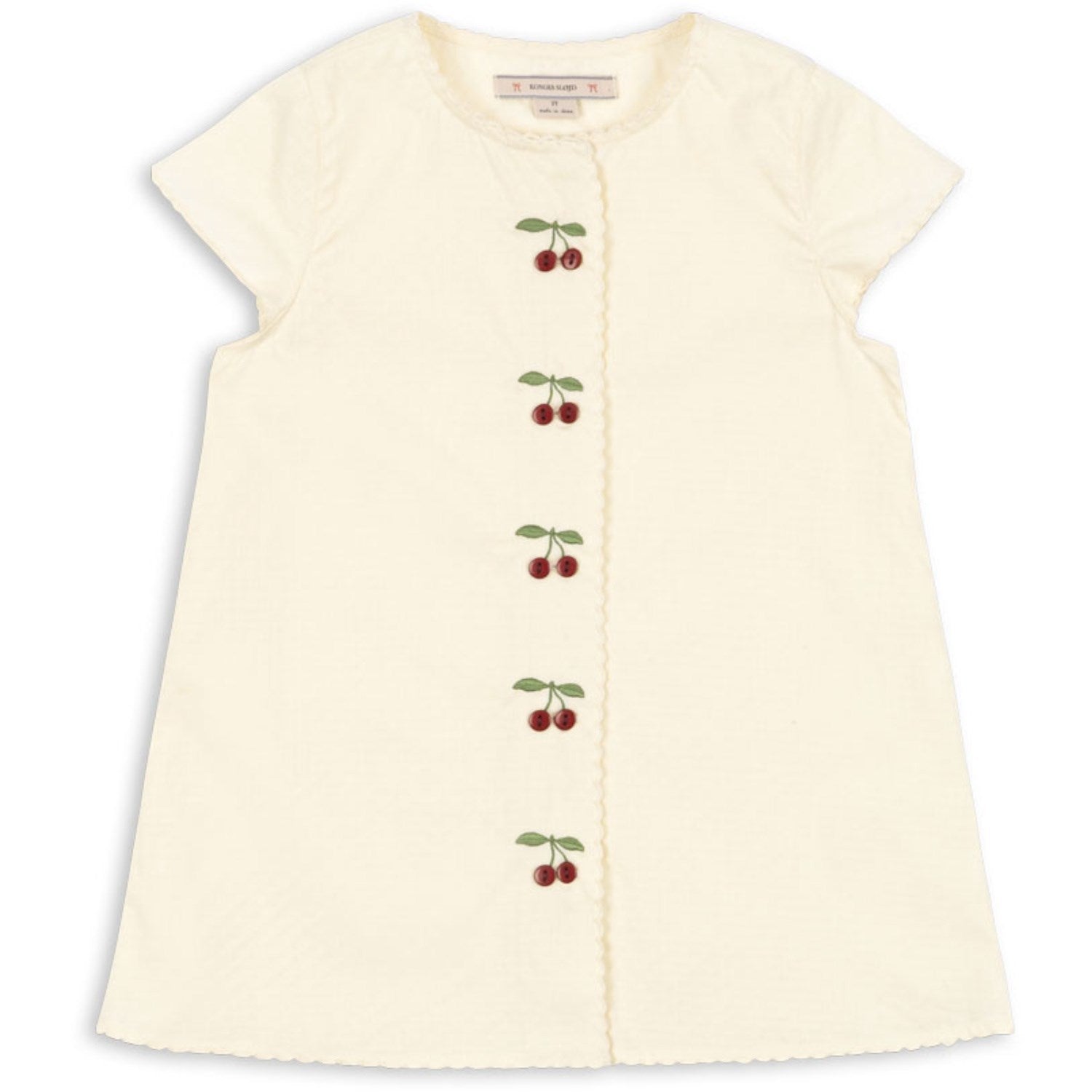 Oppdag den herlige Konges Sløjd Cloud Cream Evia Cherry Kjole Gots, perfekt for varme sommerdager. Denne sjarmerende kjolen er laget av 100 % økologisk bomull, og er både myk og komfortabel. Med sitt enkle, rette snitt og korte ermer er den ideell for aktiv lek. De delikate øyedetaljene og det lekne kirsebærbroderiet med matchende knapper foran tilfører stil og karakter. Kjolen er lett å ta vare på, og er et miljøvennlig valg for den motebevisste mini.