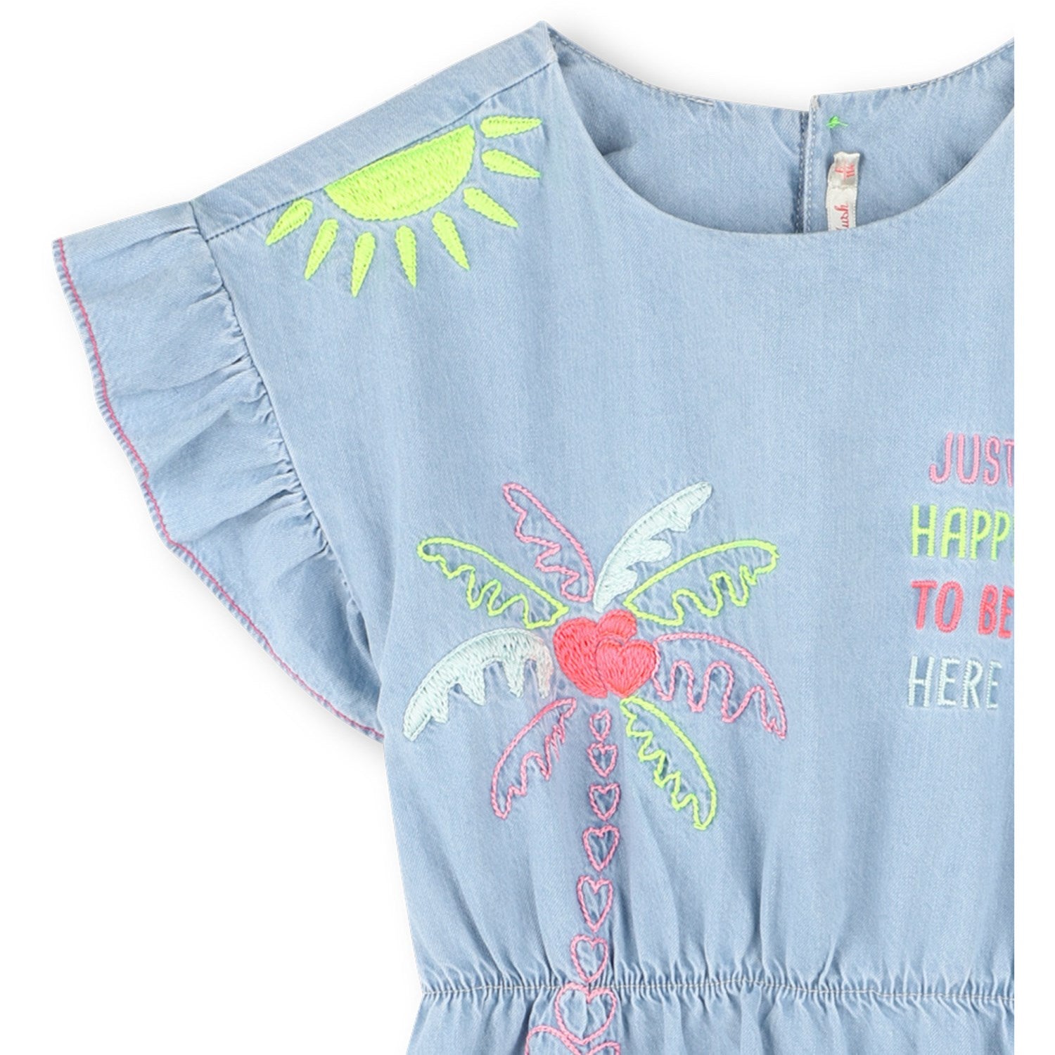 La den lille stjernen din skinne i denne sjarmerende Billieblush denimkjolen! Med sine søte korte volangermer, behagelige runde hals og praktiske elastikk i midjen er denne kjolen både vakker og funksjonell. Den smarte knappelukkingen på baksiden gjør den enkel å ta av og på, mens det delikate broderiet foran gir et snev av lekenhet. Perfekt for en dag full av eventyr!