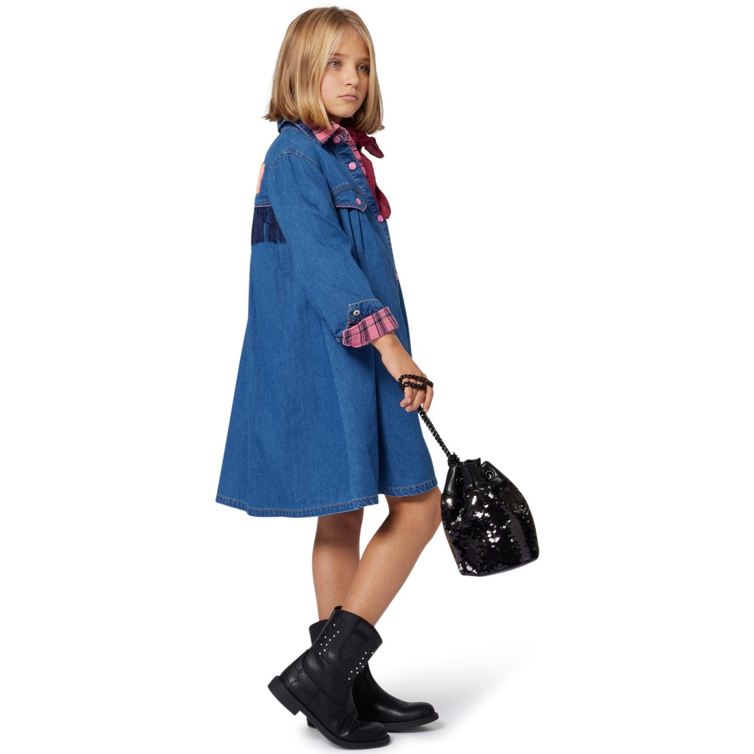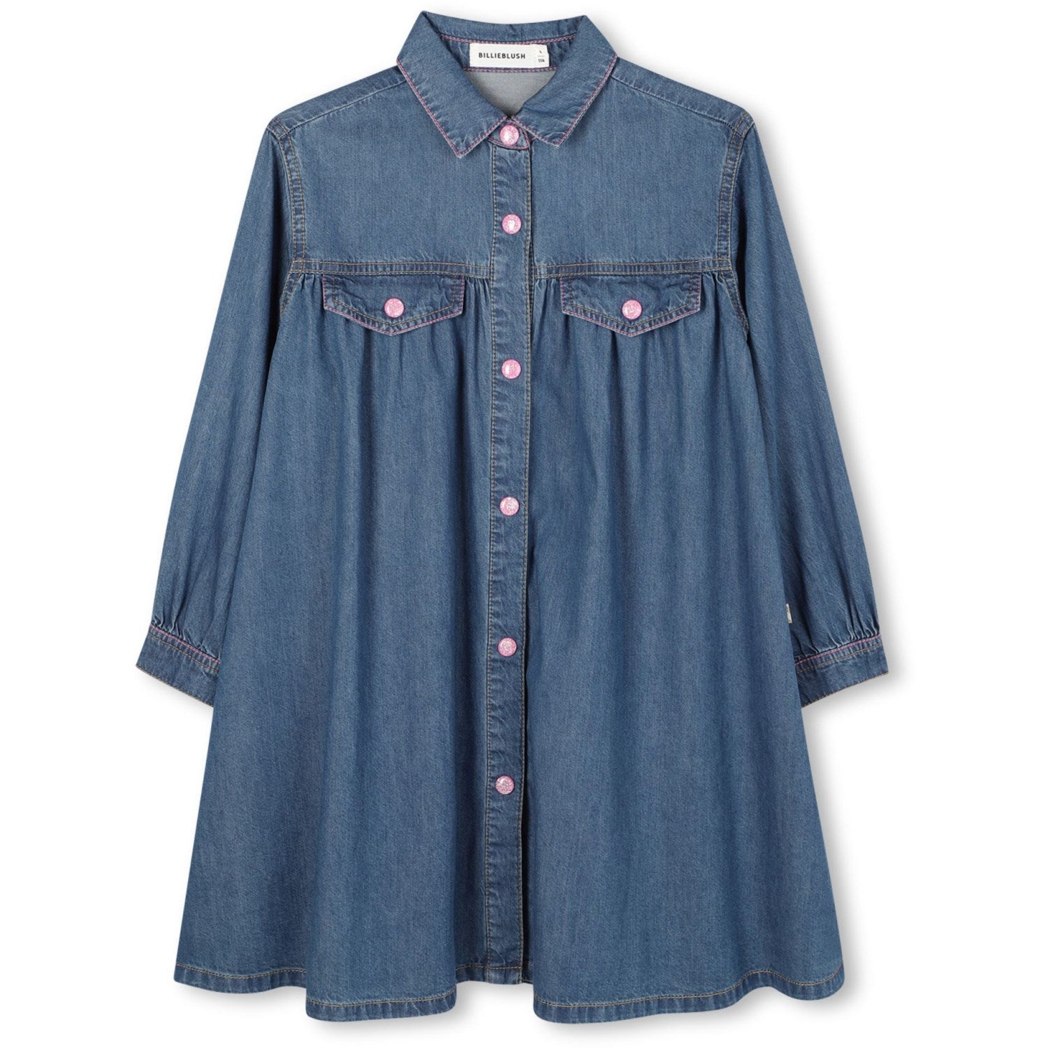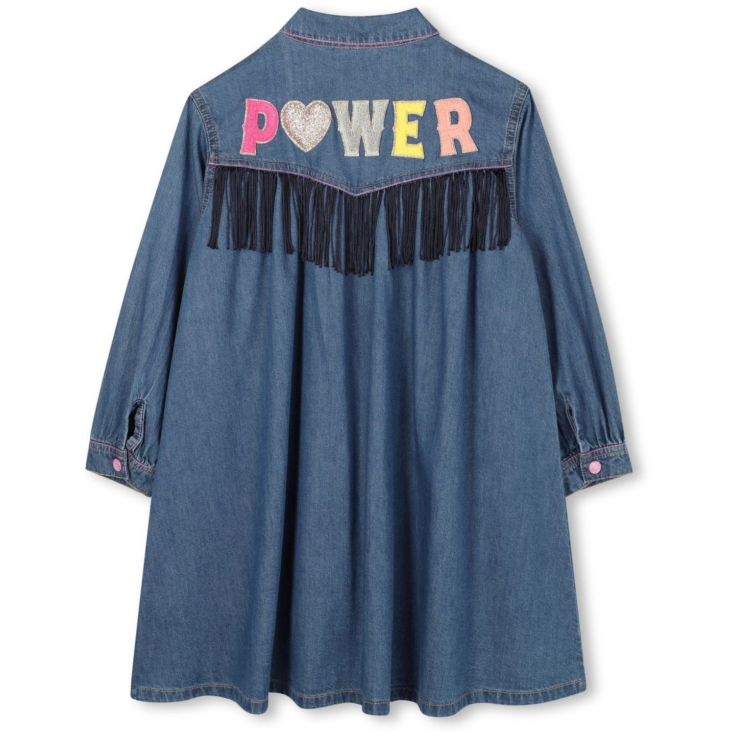 Denne morsomme og funky Billieblush denimkjolen er perfekt for barnets garderobe! Kjolen har lange ermer og en stilig skjortekrage, og lukkes enkelt med trykknapper foran. På baksiden av kjolen er det en leken illustrasjon med frynser som gir et snev av sjarm. Denne kjolen er komfortabel og stilig, og er ideell for både lek og spesielle anledninger.