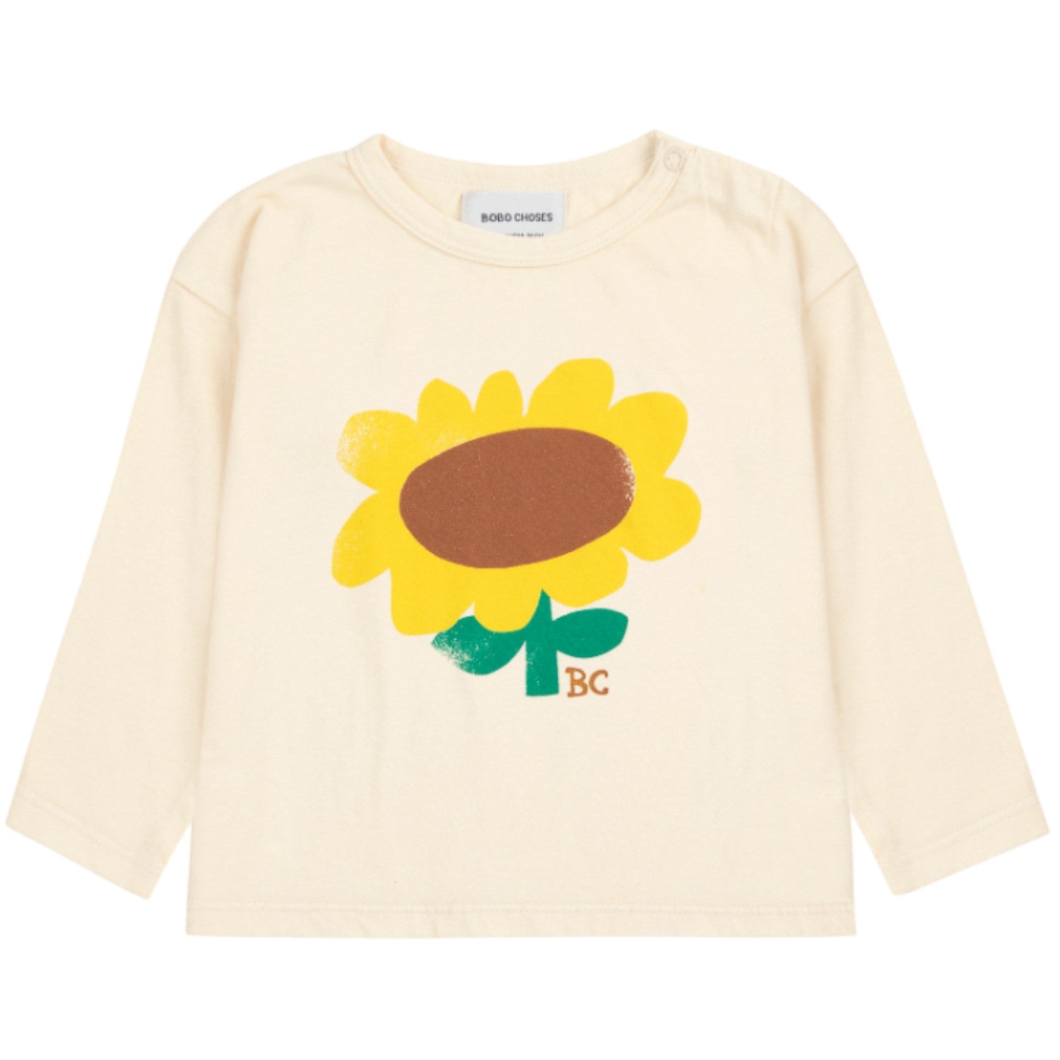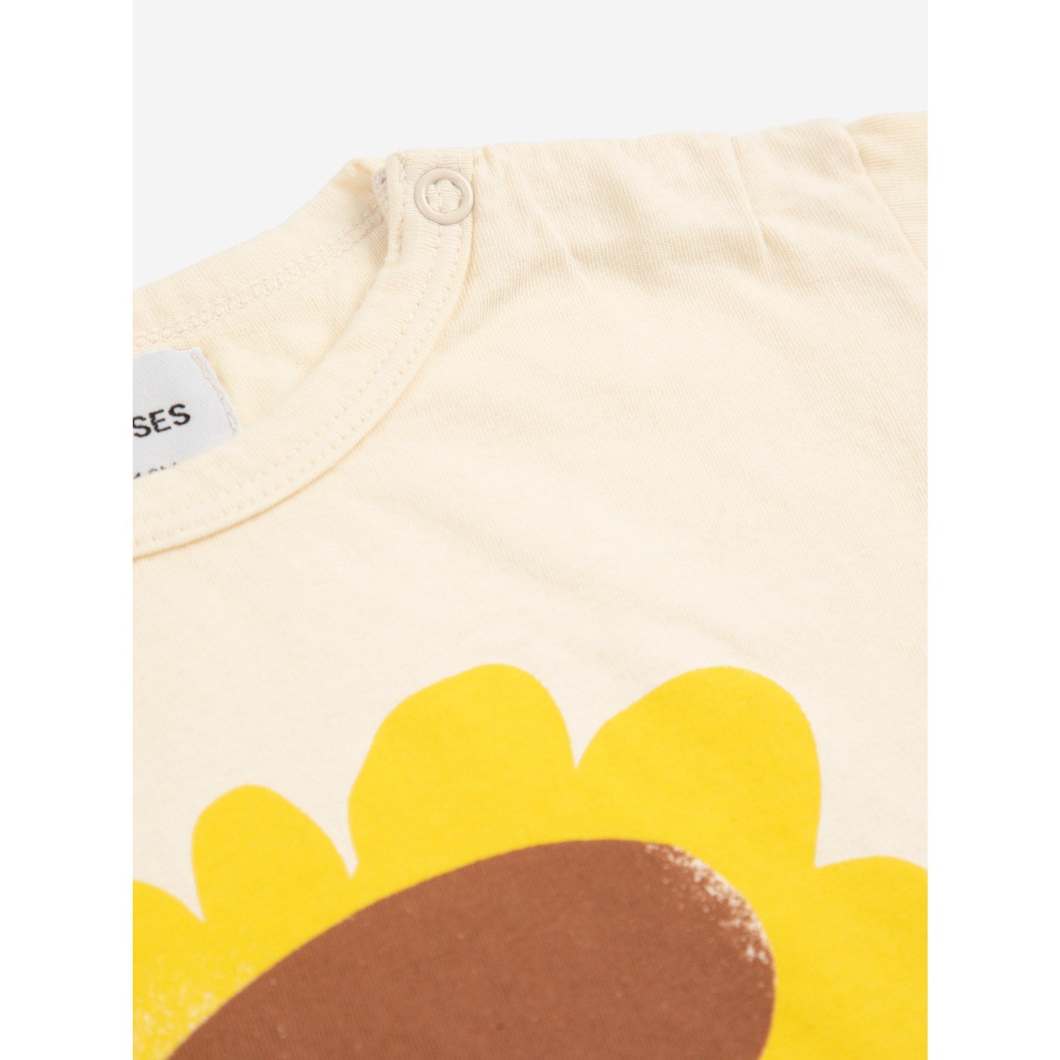 Lys opp hverdagen med Bobo Choses Offwhite Sunflower T-skjorte! Laget av behagelig bomullsmateriale, prydet med et livlig solsikke-design, og tilgjengelig i forskjellige størrelser og passer perfekt til aktive barn. T-skjorten kombinerer stil med slitestyrke og enkel vask, ideell for både lek og utflukter.