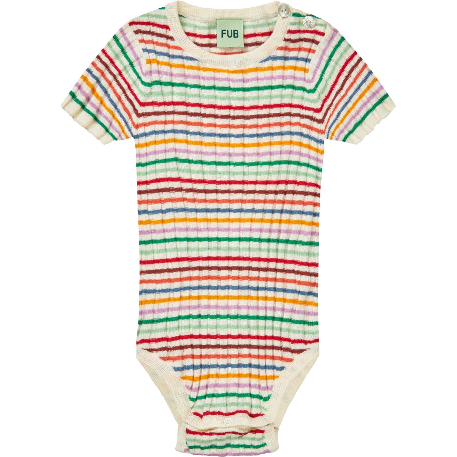 Gled barnet ditt med den herlige FUB multi stripe Baby Rib Body! Denne babybodyen er laget av 100 % sertifert økologisk bomull, som er både skånsom mot barnets hud og miljøet. Med sin brede ribbestruktur og korte ermer, kombinant med en rund hals uthevet av en kontrastsøm, tilbyr den både komfort og stil. En praktisk knappelukking ved skulderen, utstyrt med elegante perleskallknapper, gjør den lett å ta av og på, mens trykknapper i skrittet sikrer enkel bleieskift. Denne bodyen er perfekt for daglig bruk, og tåler godt hyppig vask ved bruk av skånsomme metoder.
