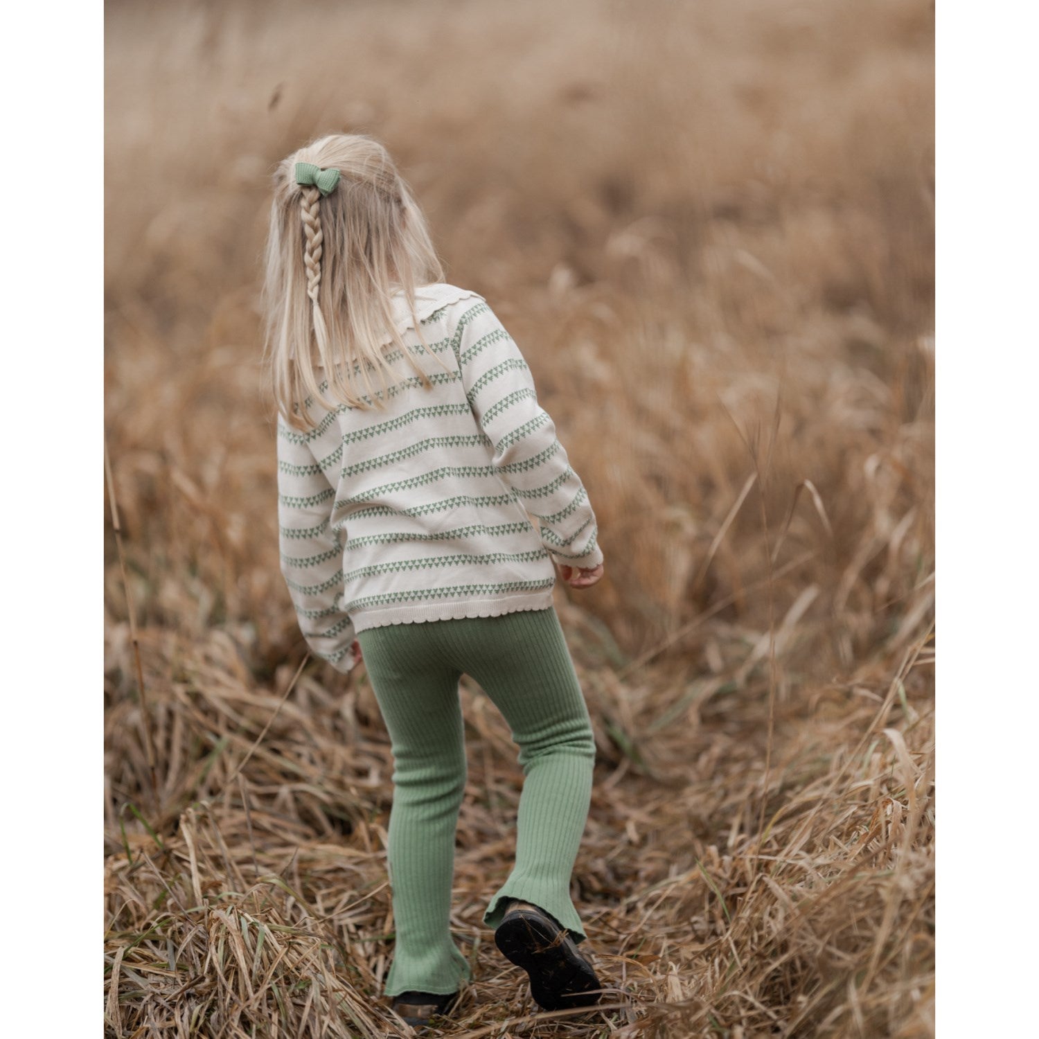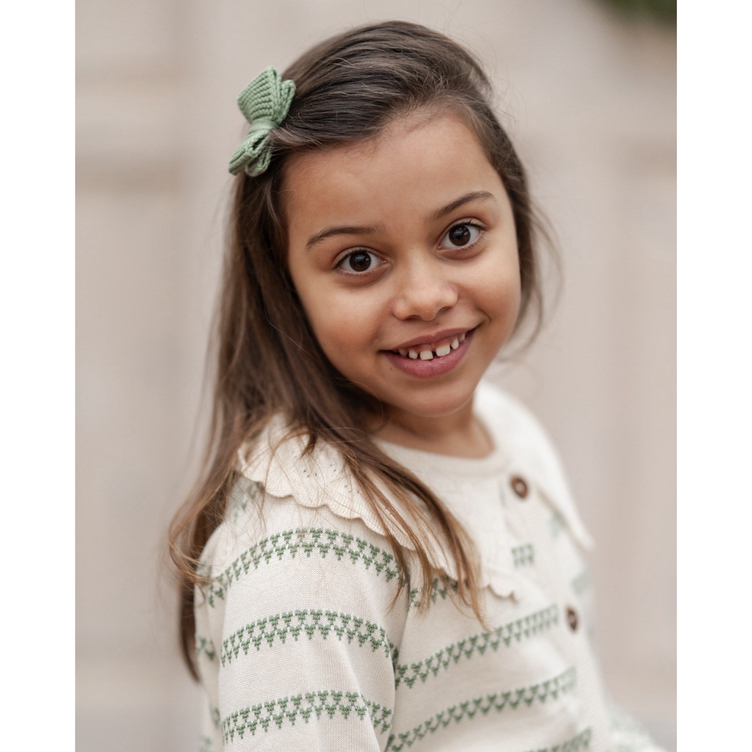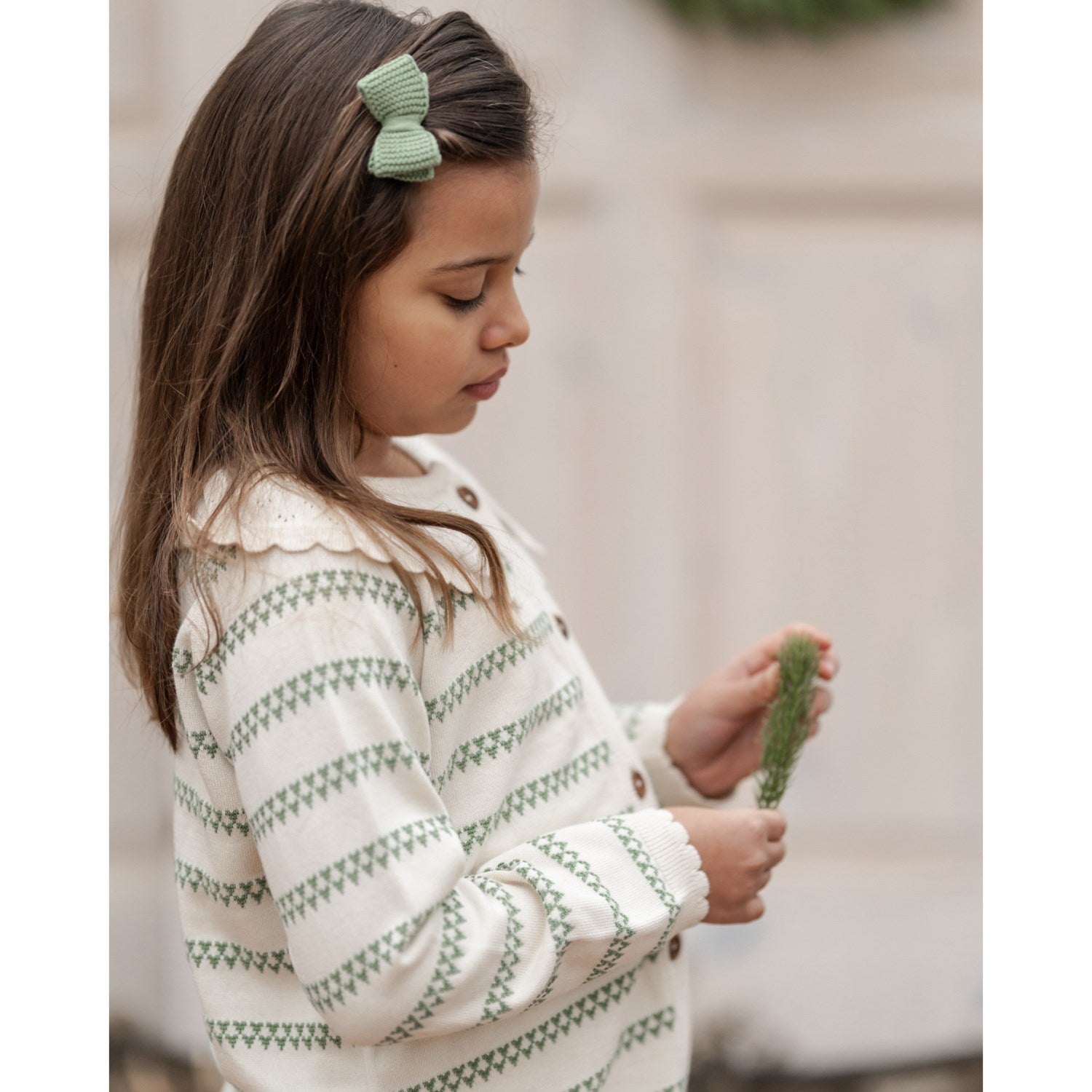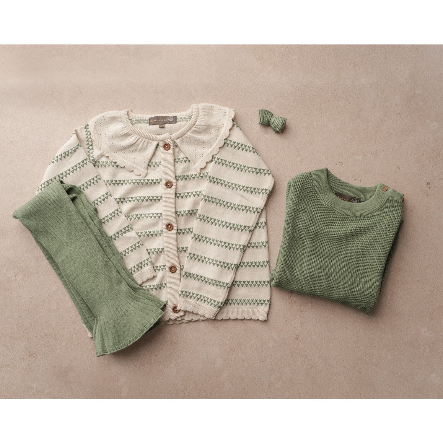 Sett et smil på barnets ansikt med vår Hanevild Shale Green Heart Cardigan, en ubestridelig sjarmerende tillegg til enhver barnegarderobe. Denne cardiganen er nøye laget av 100 % økologisk bomull, og garanterer både komfort og holdbarhet. Det lekne hjertemønsteret forsterkes av en elegant blondekrage og sjarmerende treknapper som skaper en stilfull åpning. De delikate blondekantene ved ermene og nederst tilfører en ytterligere følelse av raffinement. Tilgjengelig i ulike størrelser for å sikre en perfekt passform for ditt barn, kan denne cardiganen lett kombineres med matchende tilde-bukser og en tanja-sløyfe for en fullstendig look. Vaskeråd er enkle: 30 grader Celsius og legg plagget flatt for tørking for å bevare form og tekstur. Ikke bare er den nydelig å se på, men den er også praktisk og enkel å vedlikeholde.