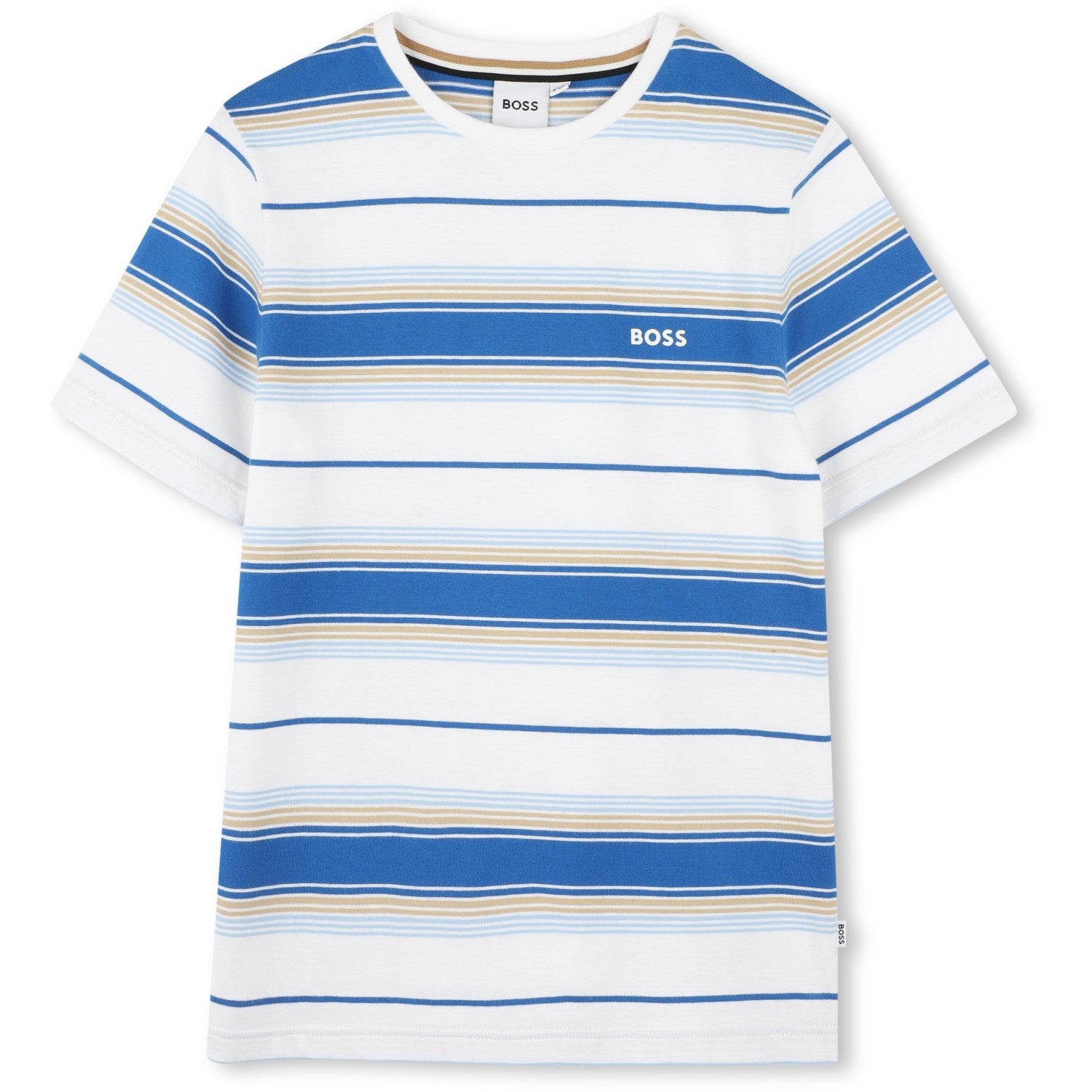 Denne Hugo Boss kortermede T-skjorten i lyseblått er perfekt for enhver liten trendsetter. Laget av myk 100 % bomull med et stilig vevd stripemønster som sikrer total komfort og bevegelsesfrihet hele dagen. Den er utsmykket med en iøynefallende "BOSS"-logo på brystet og en subtil vevd logo på siden som gir et snev av eksklusivitet. Et must i enhver liten fashionistas garderobe!
