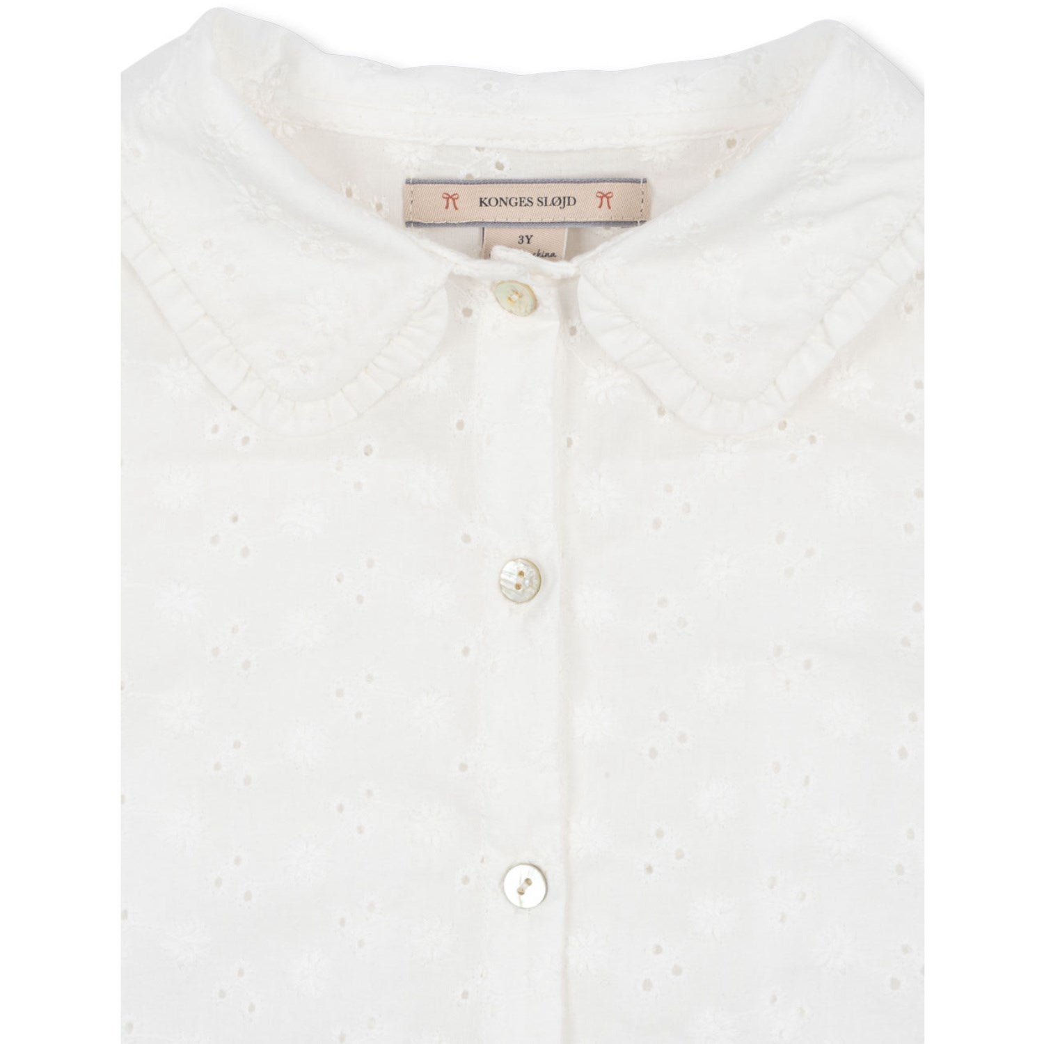 Oppdag den elegante Konges Sløjd Lacey Halsbånd Skjorten i Optic White. Dette stilige plagget er laget av 100 % bomull og har klassisk broderie anglaise, noe som gir et tidløst preg. Skjorten er designet med en fin krage, elastiske mansjetter og sjarmfulle perlemorsknapper. Den hvite fargen og det luftige mønsteret gjør den perfekt for enhver anledning, samtidig som den er behagelig og holdbar for lekne barnedager.