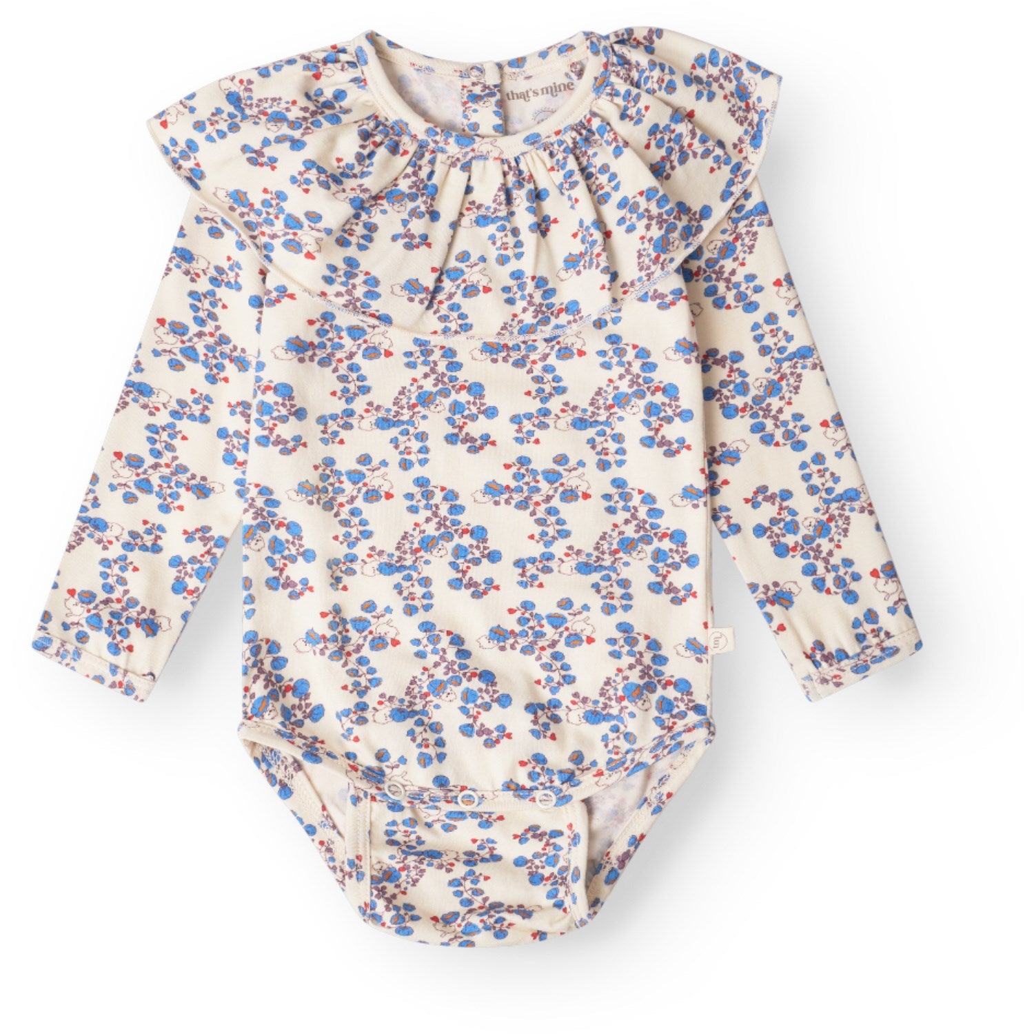 Oppdag den sjarmerende "That's Mine Blue Bells Ella Bodystocking", ideell for de minste. Dette plagget er laget av en ultramyk blanding av bomull og modal, noe som sikrer maksimal komfort. Den stilige designen inkluderer en elegant krage og kommer i flere herlige mønstre som tilfører lekenhet. Med to rader justerbare metallknapper kan størrelsen tilpasses etter hvert som barnet vokser, noe som gjør bodystockingen til et praktisk valg. Lett å vedlikeholde, denne bodystockingen kombinerer funksjonalitet med delikat stil.