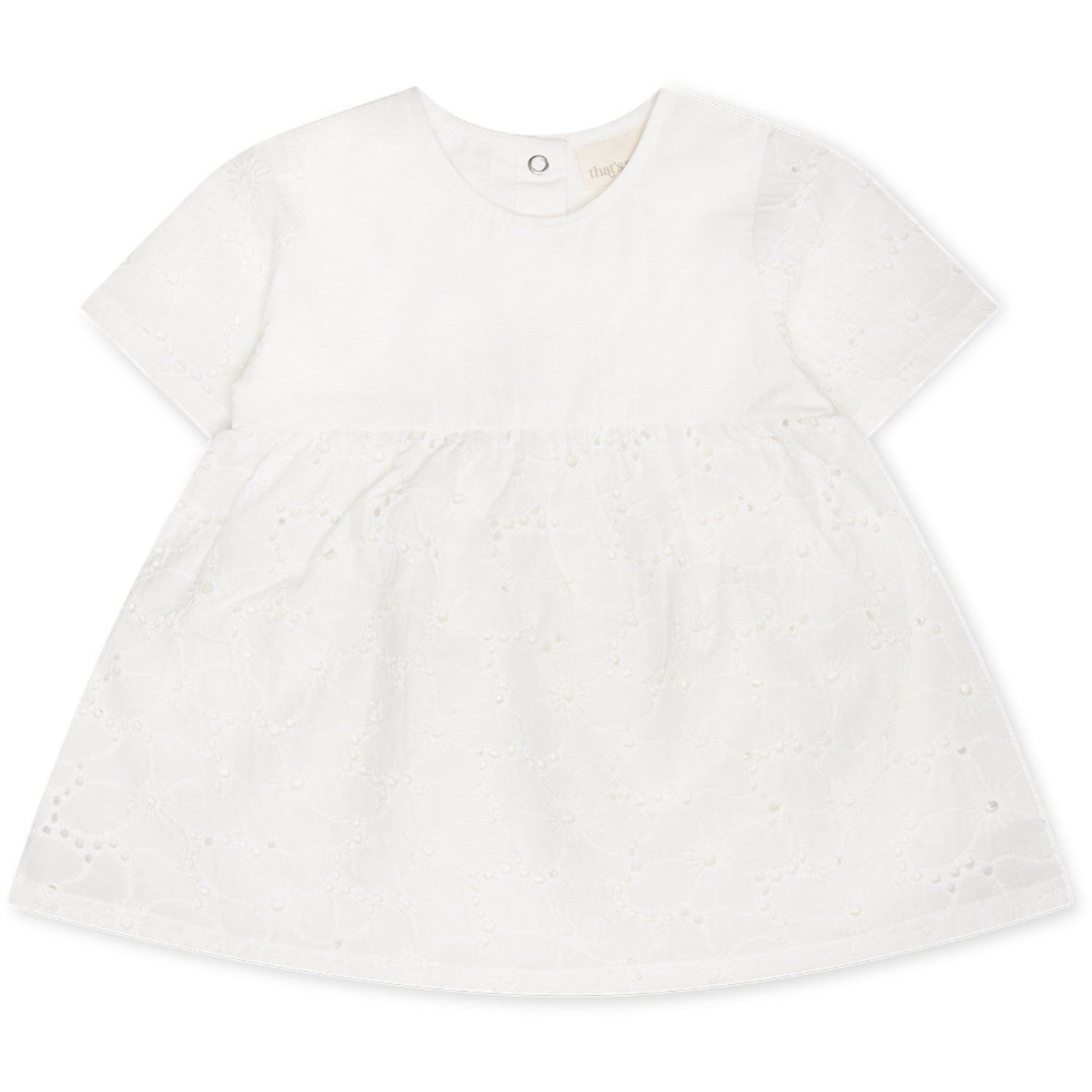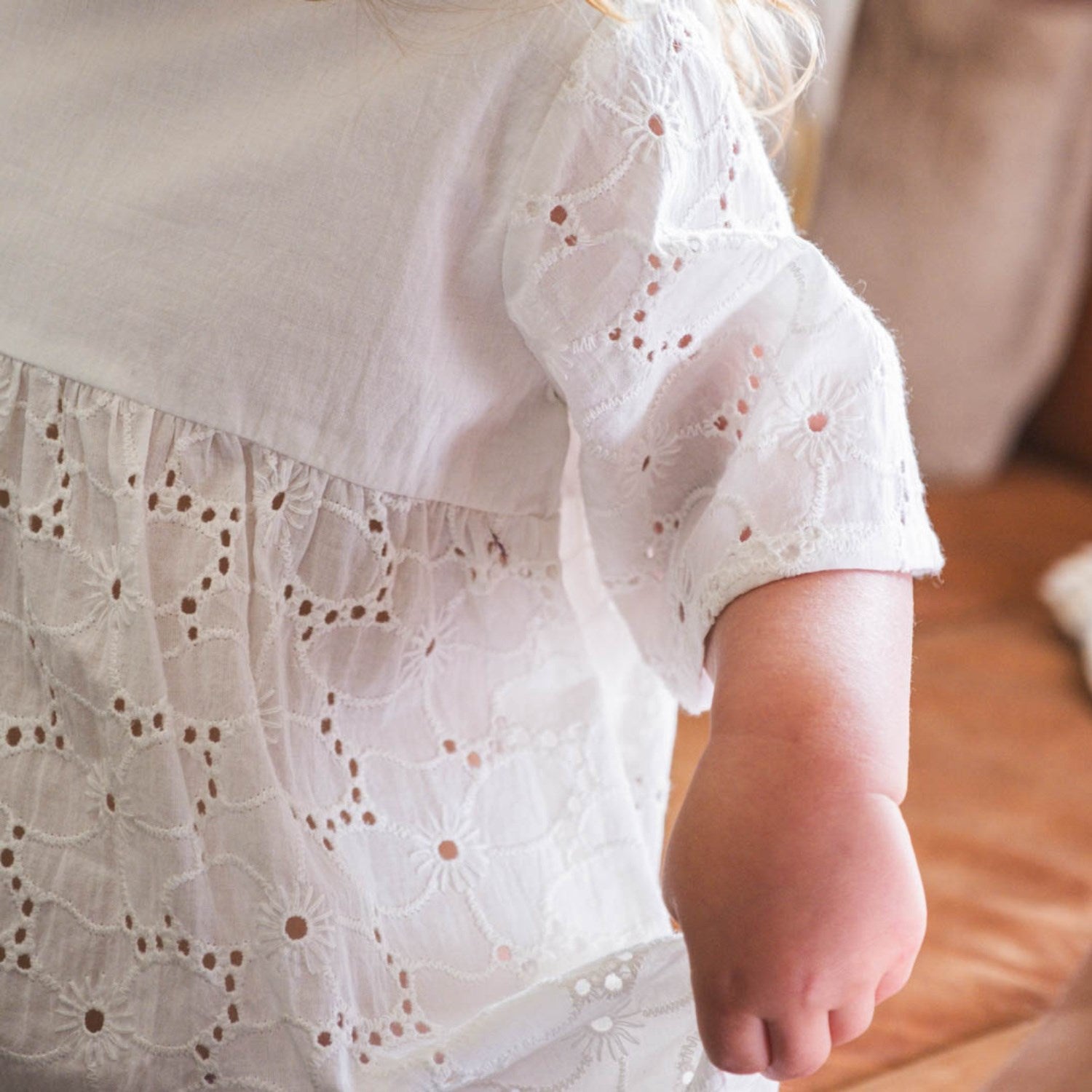 Gi din lille prinsesse et magisk utseende med "That's Mine Brilliant White Ilia Kjole". Denne nydelige kjolen skinner i ren hvit, fremhevet av elegant broderikant som tilfører en utsøkt detalj. Den er designet med praktiske knapper på baksiden og løse ermer for enkel dressing og komfort. Kjolelengden som slutter over kneet, kombinerer stil med bevegelsesfrihet. Perfekt for alt fra familiefeiringer til lek i parken, denne kjolen lover både stil og funksjonalitet i hver detalj.