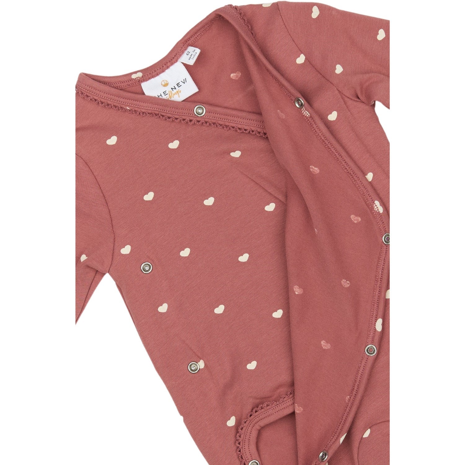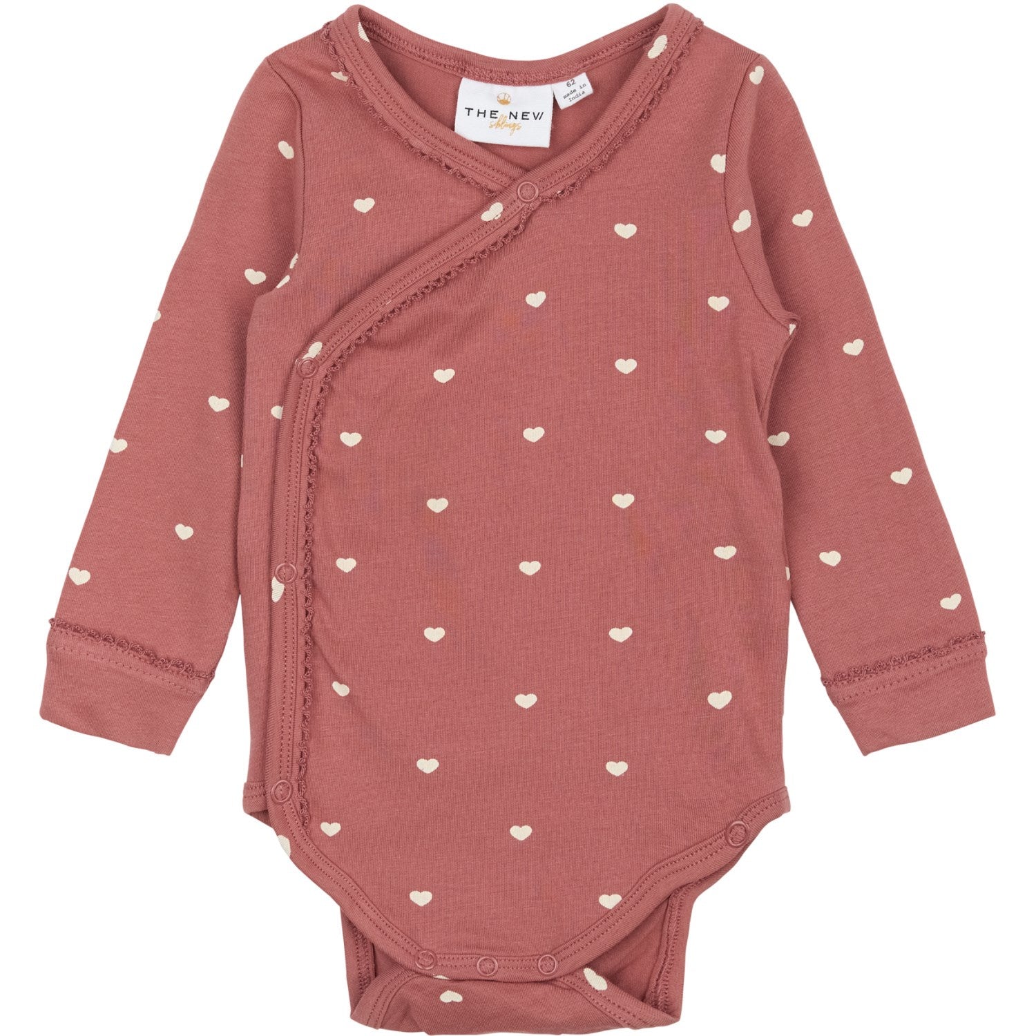 Oppdag den nydelige 'THE NEW Siblings Withered Rose AOP TNSBNova L_S Omslags Body', perfekt for småbarn og spedbarn. Dette langermede antrekket er laget av mykt, GOTS-sertifisert organisk bomull som er både behagelig og pustende, noe som sikrer din lille sin komfort gjennom dagen. Designet med et praktisk omslagsdesign og trykknapper, gjør det enkelt å skifte. Den sjarmerende rosenfargen med delikate hjertetrykk tilfører stil mens den dekorative kanten gir en siste finpuss. Både funksjonell og stilig, denne bodyen er ideell for daglig bruk og spesielle anledninger. Matcher perfekt med TNSBNova Leggings for et komplett og søtt sett.