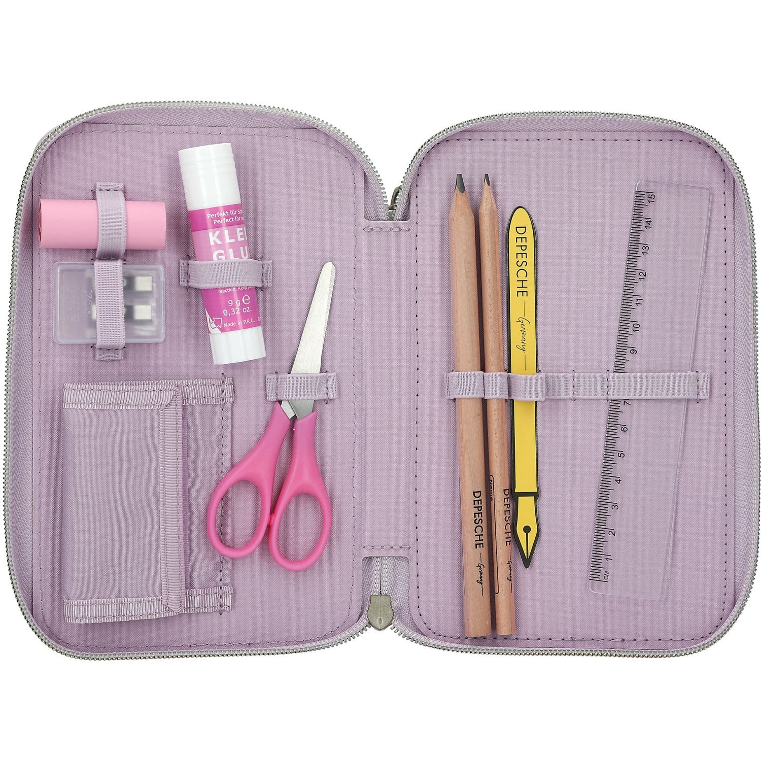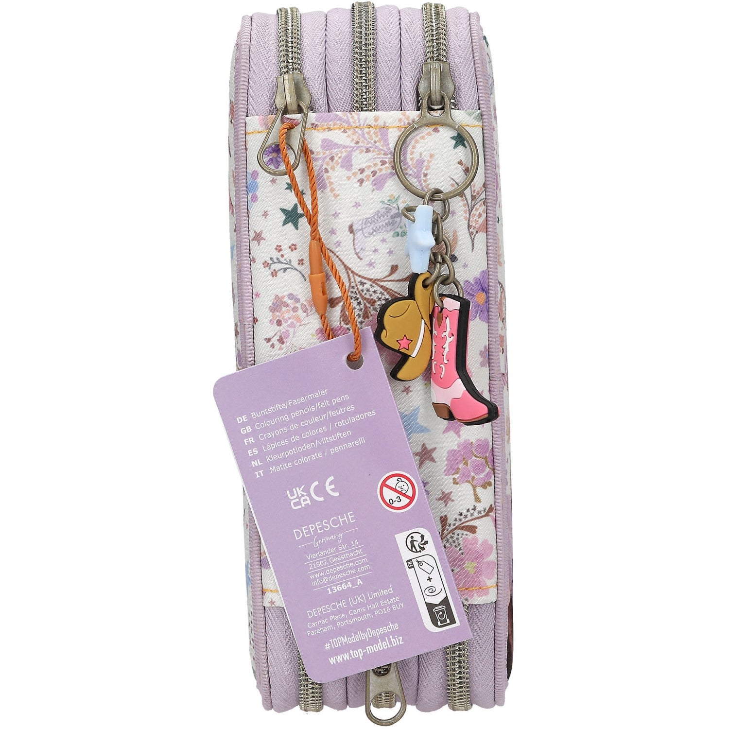 Gi barnet ditt et touch av cowgirl-cool med TOPModel Cowgirl Triple Pencil Case. Dette sjarmerende pennaleet i kremfarge pyntet med bleklilla detaljer, viser et stort, romantisk modellmotiv med en gitar, omkranset av et delikat mønster med små blomster, blader, stjerner og cowboystøvler. Det praktiske designet inkluderer tre separate rom, grundig organisert og forhåndsfylt med alt barnet trenger for skoledagen: 18 farge- og filtpenner, 2 blyanter, en spisser, viskelær, linjal, saks og limstift, komplett med en liten borrelåspose for småting. Pennalet er laget av 100% PES, noe som sikrer holdbarhet og lett vedlikehold. Den sjarmerende glidelåsen topper det hele med en leken cowboyhatt, boots og en stjerne, noe som garantert stimulerer barnets kreativitet og nysgjerrighet.