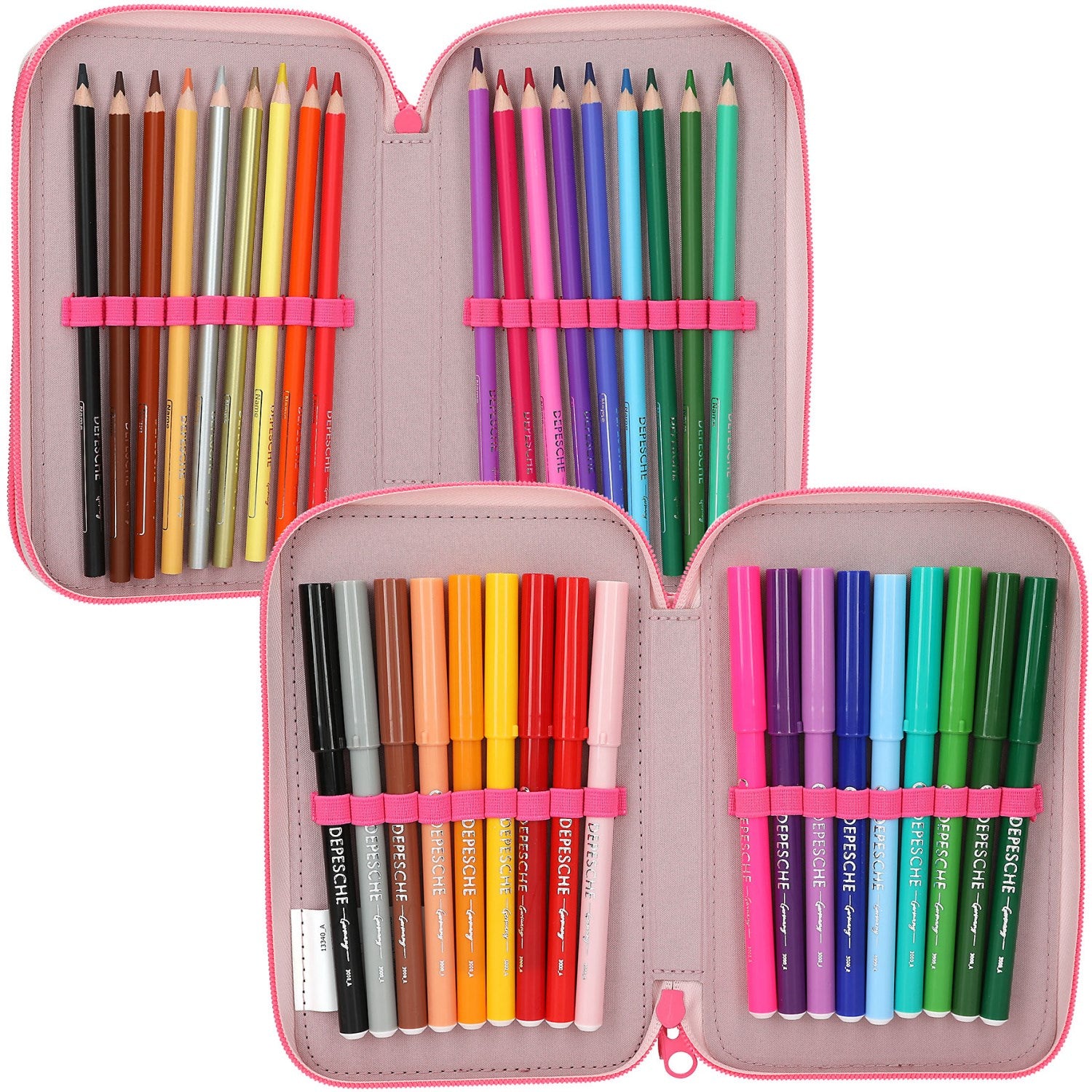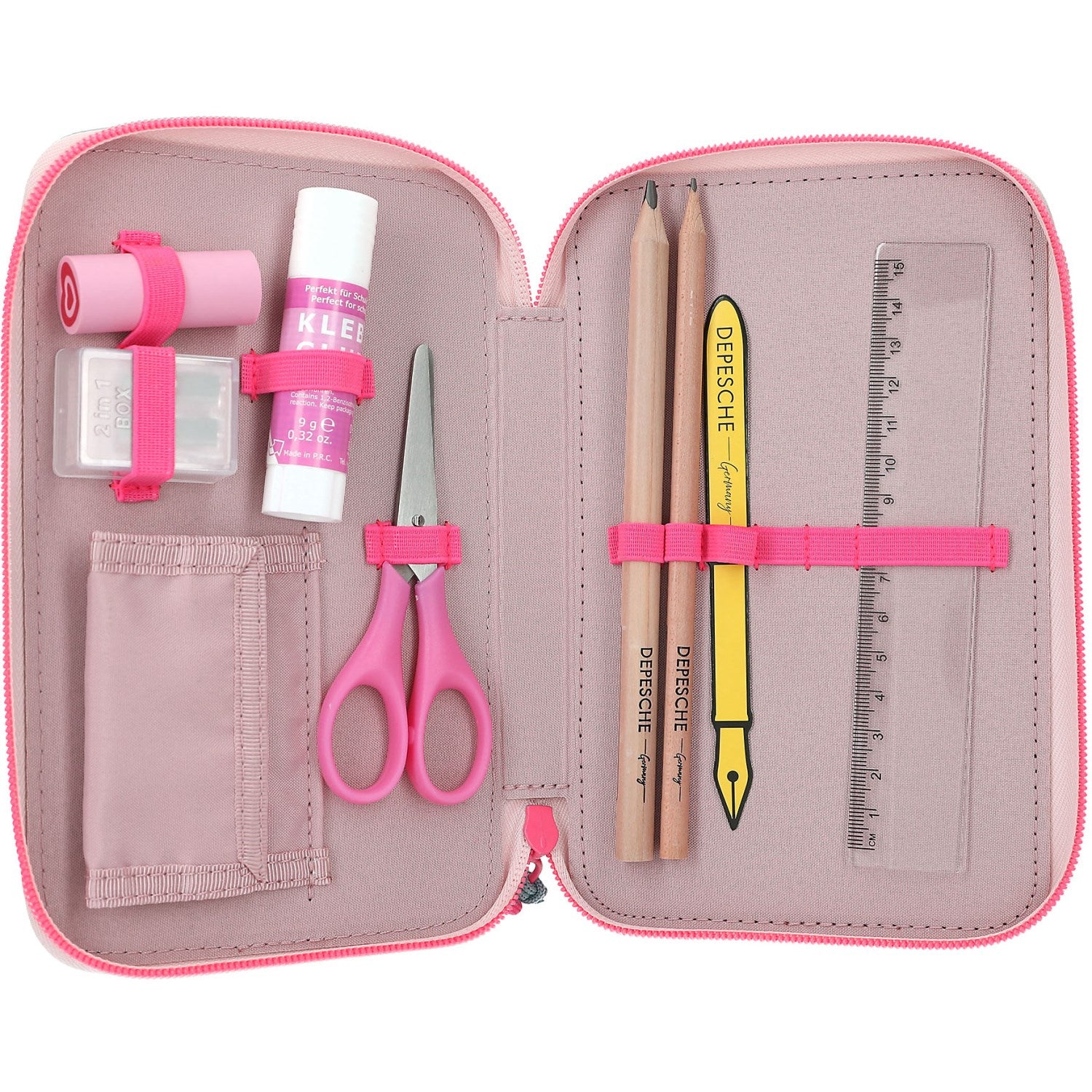Gjør skolestarten ekstra spennende med TOPModel Triple Pencil Case Capybara! Dette stilige penalhuset i jeansstoff med lekne, rosa detaljer er ikke bare trendy, men også praktisk tilpasset barnas behov. Med tre separate rom tilbyr det enkel organisering av skolesaker som inkluderer 18 tusjer og fargeblyanter, to blyanter, samt nødvendigheter som spisser, viskelær, saks og limstift. Komforten er ivaretatt med myke glidelåstrekkere dekorert med fargerike bånd og et sjarmerende capybara-anheng, noe som gjør åpning og lukking lekent og enkelt for små hender. Hovedmaterialet i 100% polyester sikrer slitestyrke og enkel vedlikehold. En allsidig og underholdende følgesvenn som stimulerer organisasjonsevner og kreativitet hos de minste!
