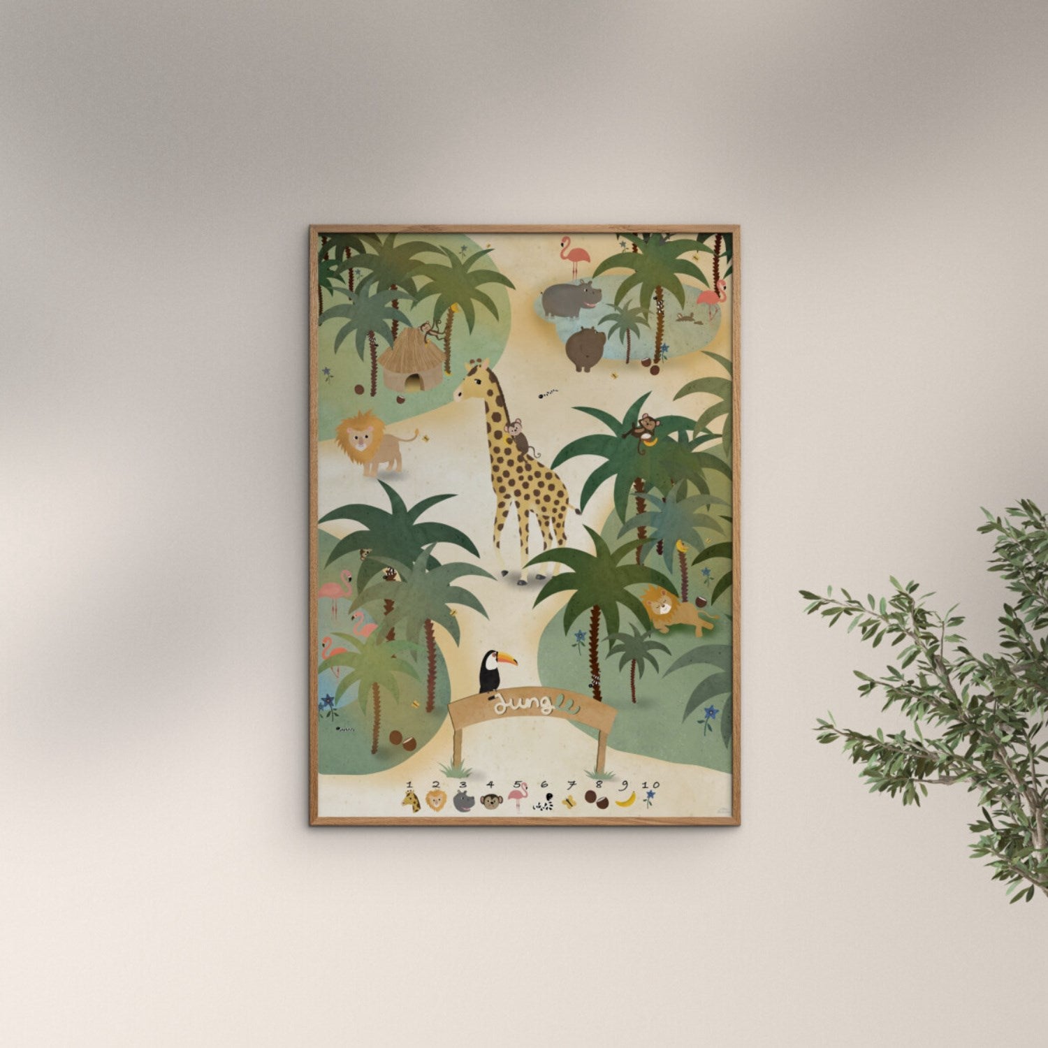 Gi barnerommet et løft med Willero Illustrasjon – Jungel, en sjarmerende plakat som vekker fantasien hos de små. Med varme farger og lekne motiver bringer den en herlig jungelfølelse inn i rommet. Denne plakaten er ikke bare vakkert designet med enkle linjer og milde fargenyanser som harmonerer med både moderne og klassiske interiørstiler, men den er også pedagogisk stimulerende for barns utvikling.