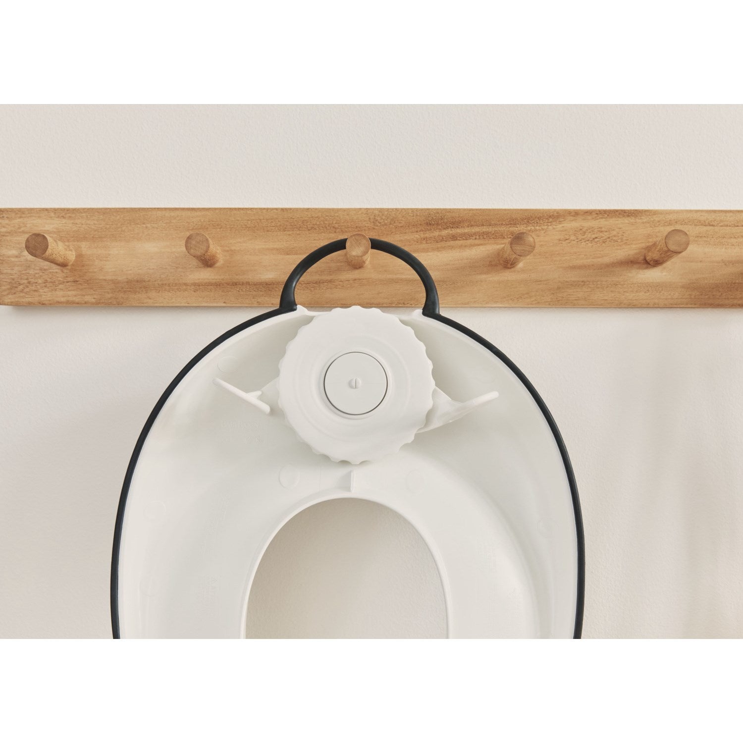Oppdag gleden ved enklere toalettrutiner med BabyBjörn Toalettsete i stilren hvit/svart design. Dette toalettsetet er utformet for å tilby stabilitet og sikkerhet for ditt barn, med en justerbar knott og en non-slip gummikant som holder setet fast på plassen. Det er spesielt designet for å være brukervennlig, slik at barnet kan bruke toalettet selvstendig. Komforten er ivaretatt med en myk form, mens den innebygde skjermen beskytter mot søl. For praktisk oppbevaring er setet utstyrt med et hendig håndtak, og det passer til de fleste toaletter, noe som gjør det til et fleksibelt valg i ethvert hjem. Med BabyBjörn Toalettsete blir toalettlæring både hygienisk og stimulerende for barnet, samtidig som det forenkler hverdagen for foreldre!