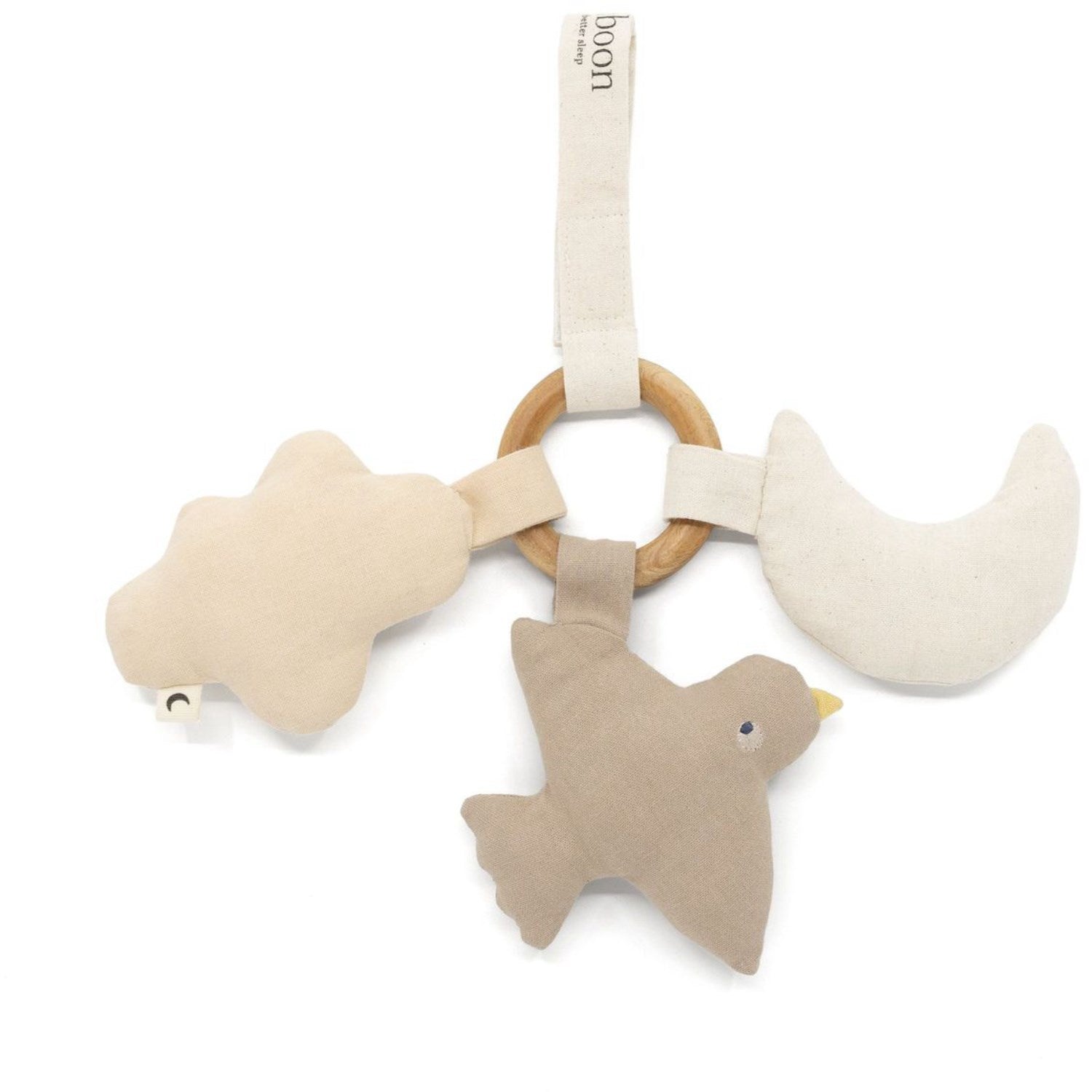 Med deres nøytrale og fine farger tilbyr disse natbamsene en beroligende følelse, mens de smelter naturlig inn i resten av rommets design. Den praktiske bomullsstroppen tillater enkel festing til hengevugger, barnevogner eller vuggens justerbare stropper, slik at barnet kan føle seg trygt og komfortabelt, hvor som helst og når som helst. Dette gjør Moonboon Rose Mix Natbamser til et perfekt valg for å tilrettelegge for en søvnfylt natt, fylt med ro og trygghet. Materialer: Hovedmateriale: 100 % ogganisk bomull. Fyll: 100% polyester. Bøk Vaskeinstruksjoner: Ingen tørketrommel, Flattørking, Ingen stryking, Tørk av med fuktig klut - ikke vask, Ingen blekemiddel, Ingen renseri Sertifiseringer: OCS blandet