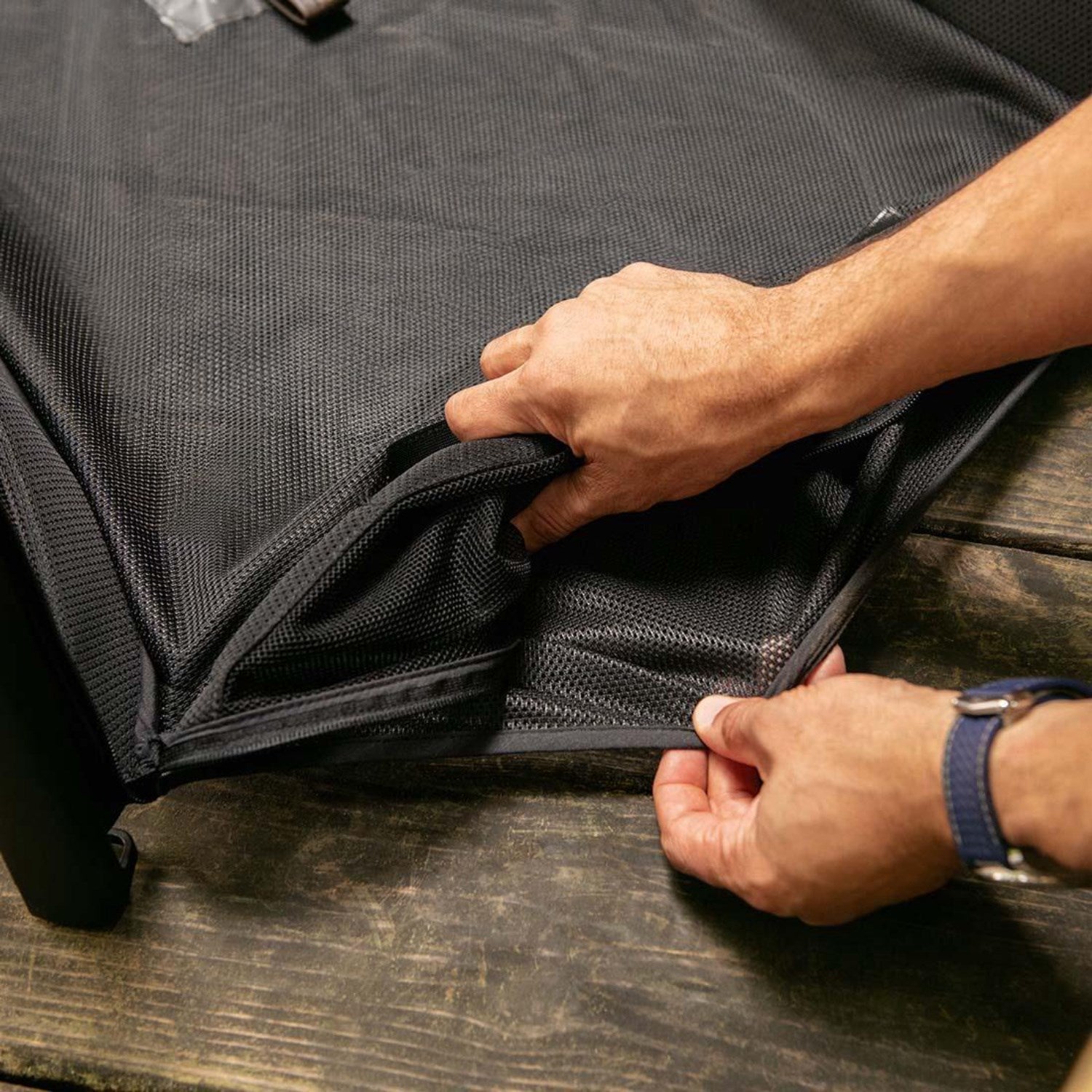 Denne reisesengen er spekket med smarte funksjoner som sikrer barnets sikkerhet og komfort. Den robuste aluminiumsrammen, polstrede kanter og klipslås på døren holder barnet sikkert, mens den pustende madrassen og det GOTS-sertifiserte økologiske bomullslakenet garanterer en behagelig søvn. Med et insektnett inkludert, gir PAAL også beskyttelse mot insekter.