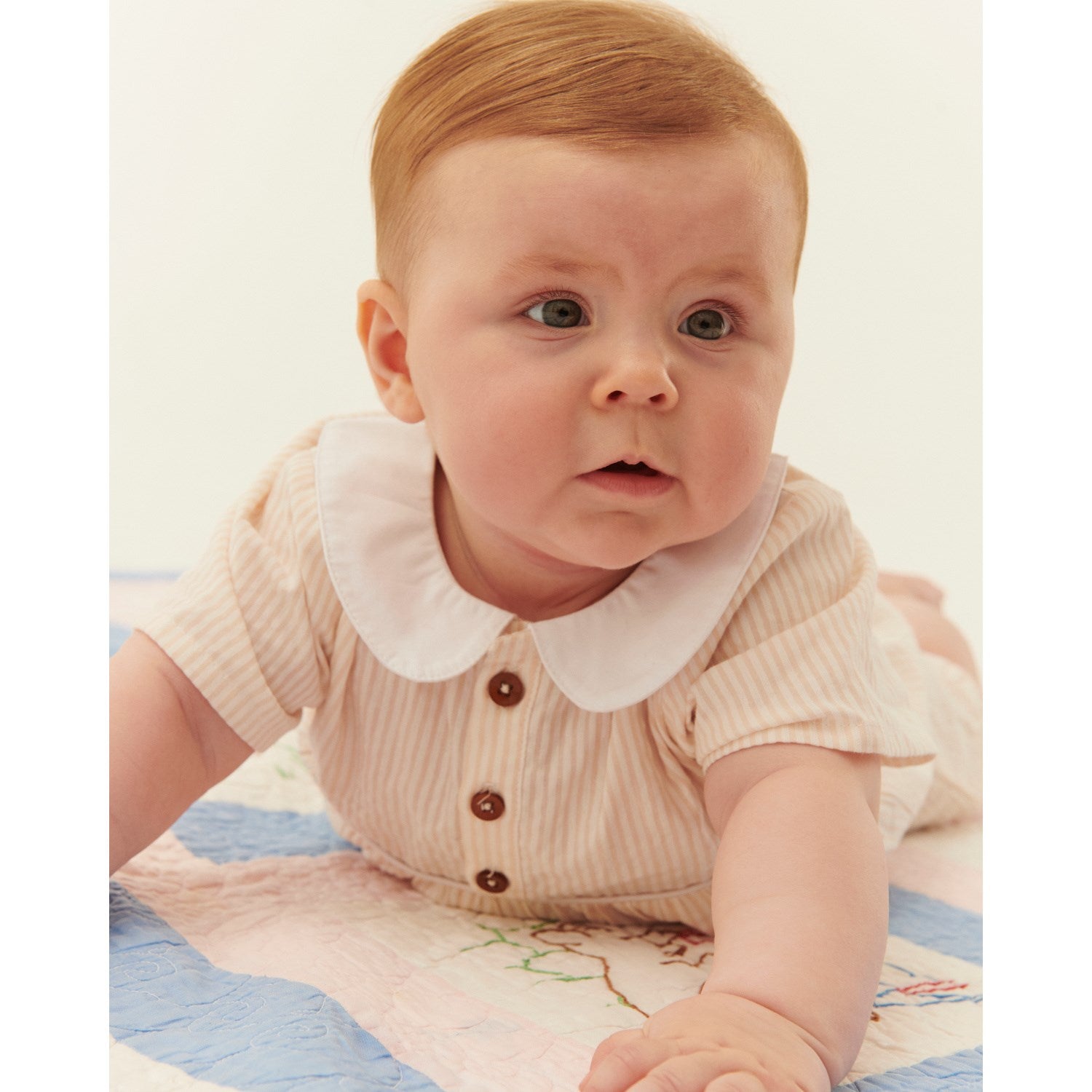 Oppdag gleden med vår sjarmerende buksedrakt fra COPENHAGEN COLORS, perfekt for din lille skatt. Dette klassiske plagget er fremstilt i 100 % GOTS-sertifisert økologisk bomull, som ikke bare er skånsom mot barnets hud, men også miljøvennlig. Den nostalgiske stilen med Peter Pan-krage og stripe-mønster i fargen Dusty Rose med cream-stripes tilfører et tidløst preg. Kombinasjonen av myk, pustende seersucker-stoff og praktiske detaljer som elastiske mansjetter og trykknapper gjør denne buksedrakten ideell for alt fra lek til lur. Lett å kle på og ta av, sikrer den komfort gjennom alle aktiviteter, mens den vedlikeholdes enkelt i maskinvask.