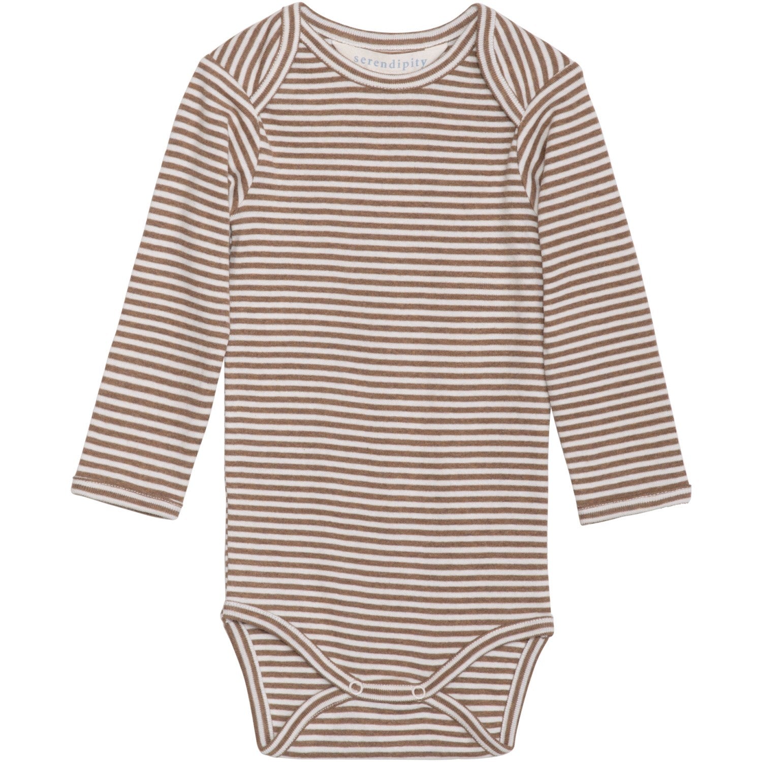 Oppdag vår sjarmerende Serendipity stripete babybody i delikate mandelbrune og off-white farger. Denne klassiske bodyen er laget av 100 % økologisk bomull, og har fått den anerkjente GOTS-sertifiseringen, noe som lover høy kvalitet og etisk produksjon. Med sitt behagelige melerte stoff og praktiske design med konvoluttåpning ved skuldrene, gjør denne bodyen det enkelt å kle på og av din lille skatt. Trykknappene ved bena sikrer at bodyen sitter godt, samtidig som den er lett å åpne ved bleieskift. Ideal for daglig bruk og passer perfekt fra hvile til lek.