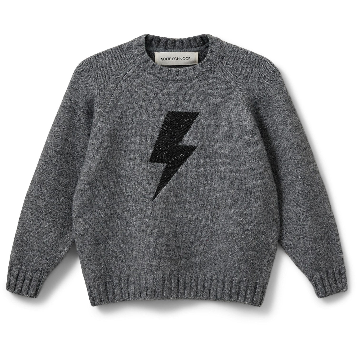 Sofie Schnoor strikkegenser i mørkegrått er den perfekte blandingen av stil og komfort. Denne genseren er laget av en myk og varmebevarende stoffblanding som holder de minste varme på kjølige dager. Det lekne lynmotivet gir et snev av moro og gjør denne strikkegenseren unik. Et must-have i enhver barnegarderobe for de små moteelskerne!