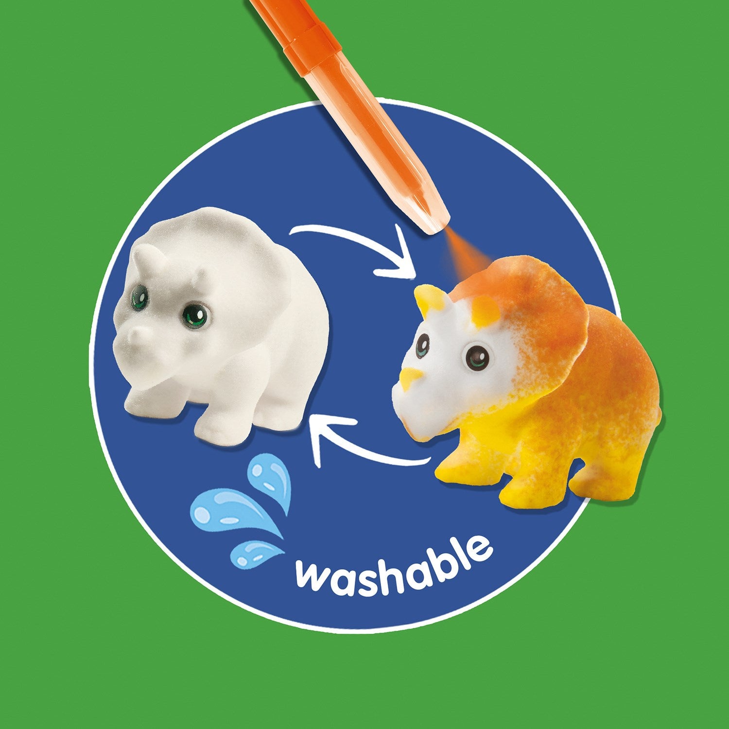 Oppdag gleden med SES Kreative pustemarkører Dinosaurer, en fantastisk måte for barn å utforske sin kreative side på! Med dette settet kan barna dekorere T-rex, Stegosaurus og Triceratops ved hjelp av fire fargerike blåsetusjer i turkis, gul, oransje og lilla. Disse markerene tillater små kunstnere å lage imponerende airbrush-effekter og detaljerte dekorasjoner ved enkelt å blåse inn i tusjene.