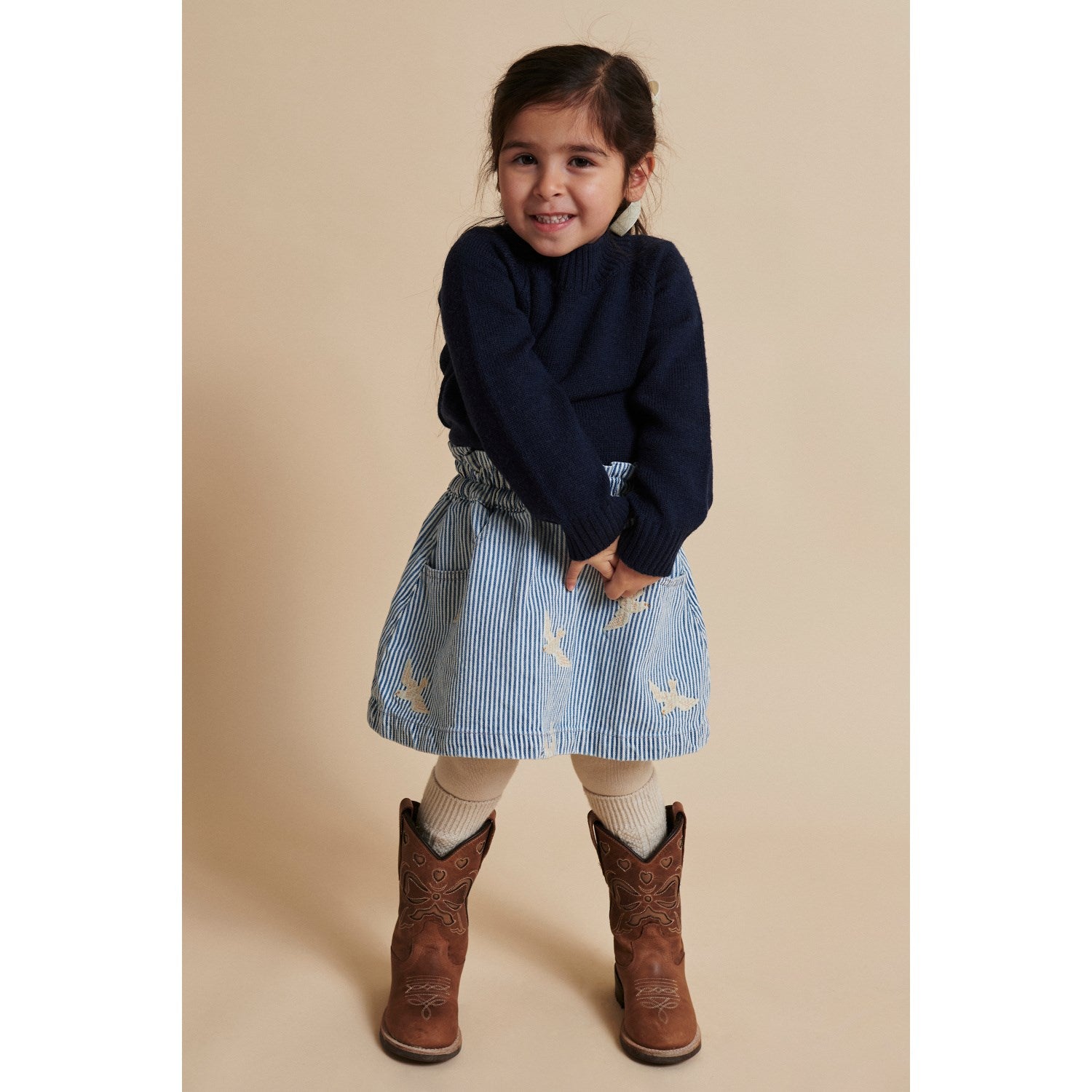 Oppdag vårt sjarmerende Copenhagen Colors denimblå stripete twill-skjørt med broderi, perfekt til lekne barnedager. Dette skjørtet har praktisk elastisk midje og lommer på sidene, designet med broderte duer for en unik stil. Laget av 100% økologisk bomull, gir det både komfort og holdbarhet. En enkel, men stilig følgesvenn for alle anledninger som gir barnet ditt bevegelsesfrihet og varighet.