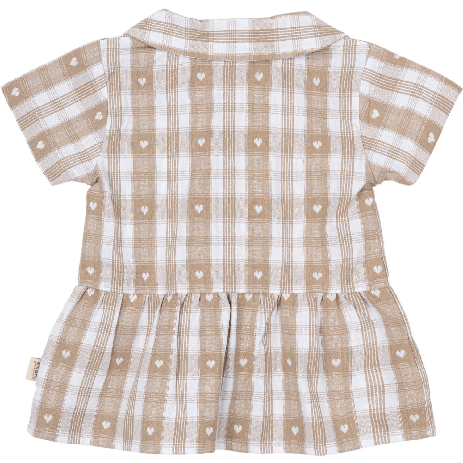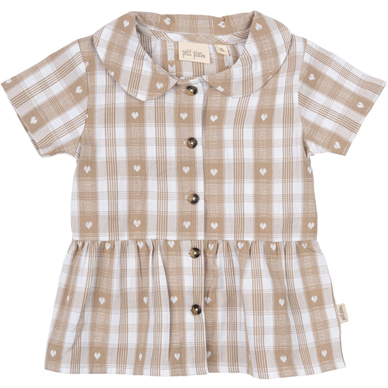 La din lille solstråle gli i denne sjarmerende kortermede skjorten fra Petit Piao! Skjorten skjemmer bort med et hjertevarmende rutemønster prydet med søte hjerter. Den runde kragen gir et snev av søthet, mens de fine rynkene i midjen gir et lekent uttrykk. Med praktiske knapper foran er denne skjorten både stilig og enkel å ta på. Perfekt for en dag fylt med eventyr! Laget med omhu i India.