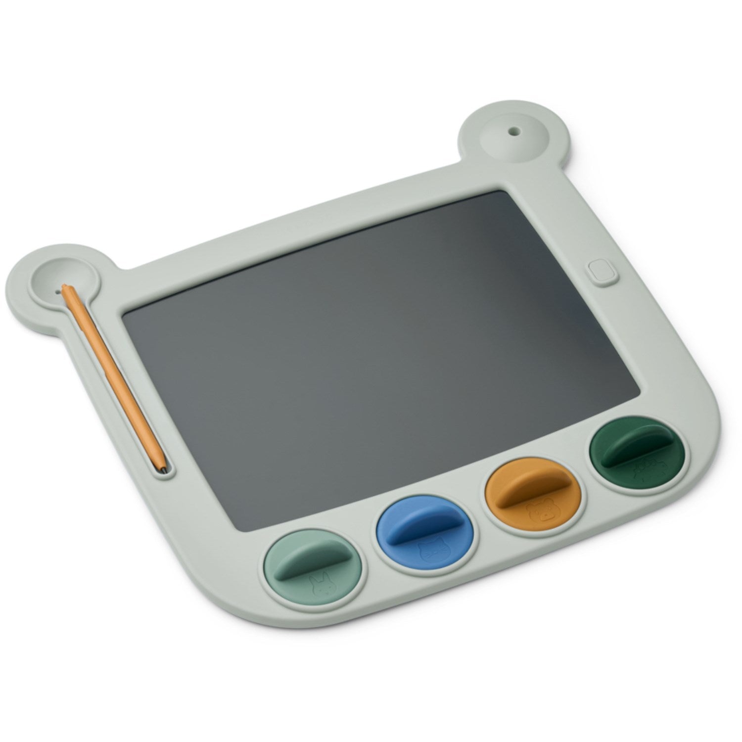 Oppdag gleden ved kreativ utfoldelse med LIEWOOD Dove Blue Multi Mix Venzora Magic Drawing Board W Stamps! Dette sjarmerende bjørneformede LCD-tegnebrettet er perfekt for små kunstnere. Utstyrt med en penn, fire underholdende silikonstempler og skjermlås for å bevare de små mesterverkene. Enkel i bruk med sin praktiske sletteknapp og sikker penneholder, gjør det lett å ta med seg overalt. Fremmer både kreativitet og motoriske ferdigheter hos barn i alle aldre. Alder: 3 år+ Materialer: Ramme og penn: 70 % magemuskler, 30 % resirkulerte magemuskler, stempler: 100 % silikon Mål: bredde (cm) 26; Lengde (cm) 26; Dybde (cm) 2.2