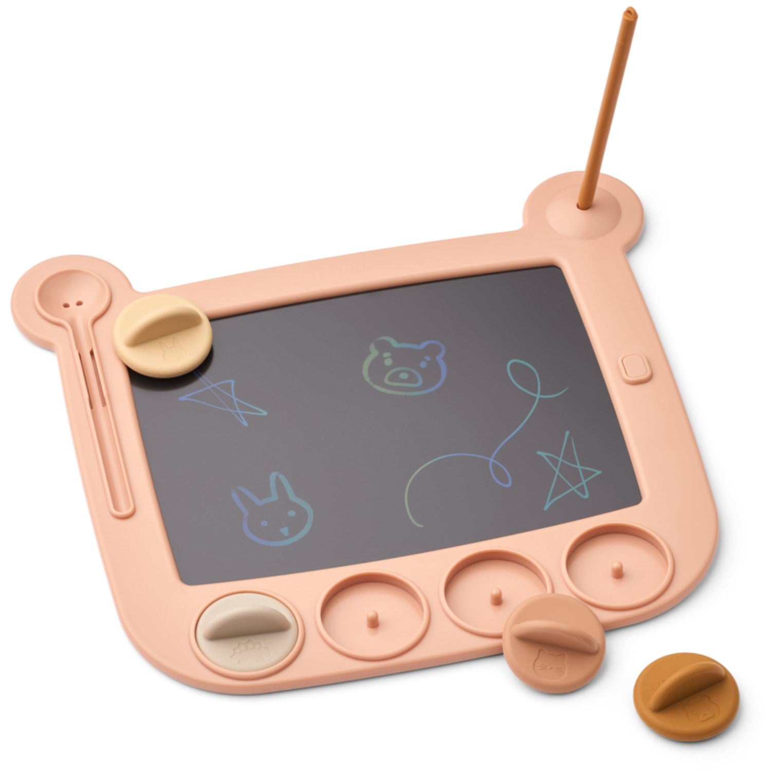 Oppdag den sjarmende LIEWOOD Pale Tuscany Multi Mix Venzora Magic Drawing Board W Stamps, perfekt for barn som elsker å tegne og skrive. Dette bjørneformede LCD-tegnebrettet kommer med en penn og fire morsomme silikonstempler, ideelt for å utforske kreativiteten. Lett og praktisk, brettet har en skjermlås for å bevare kunstverk og en enkel sletteknapp for endeløs bruk. Med robust penneholder sikres trygg oppbevaring av pennen. Et opplagt valg for de små kunstnerne, både hjemme og på reise!