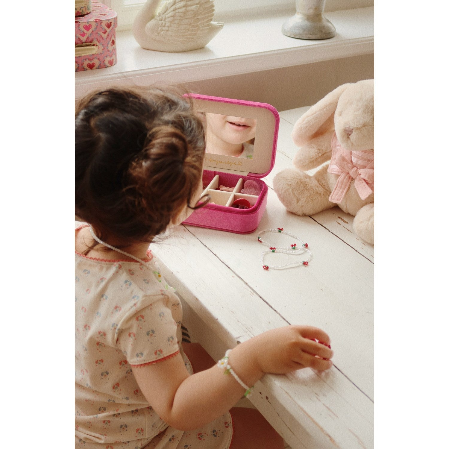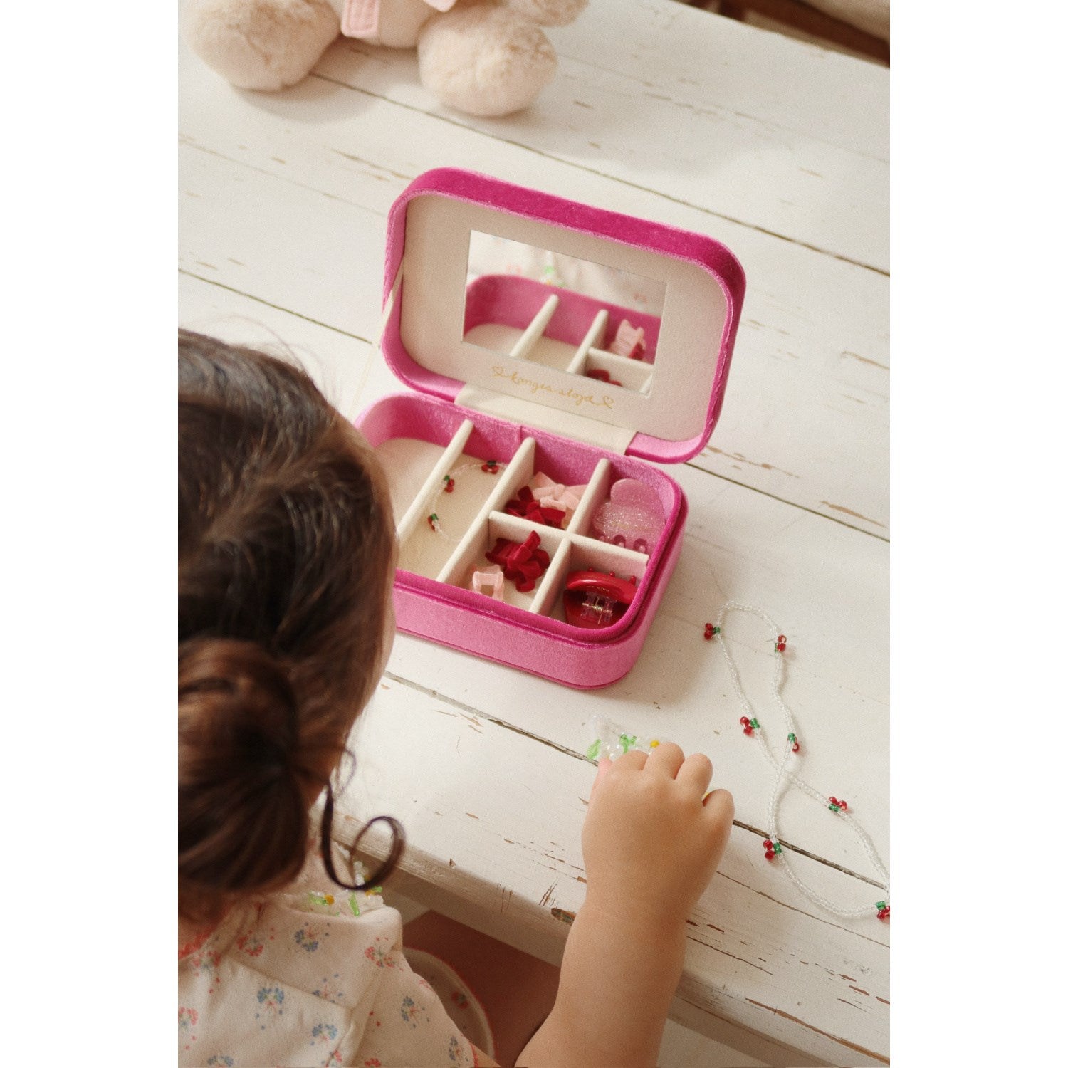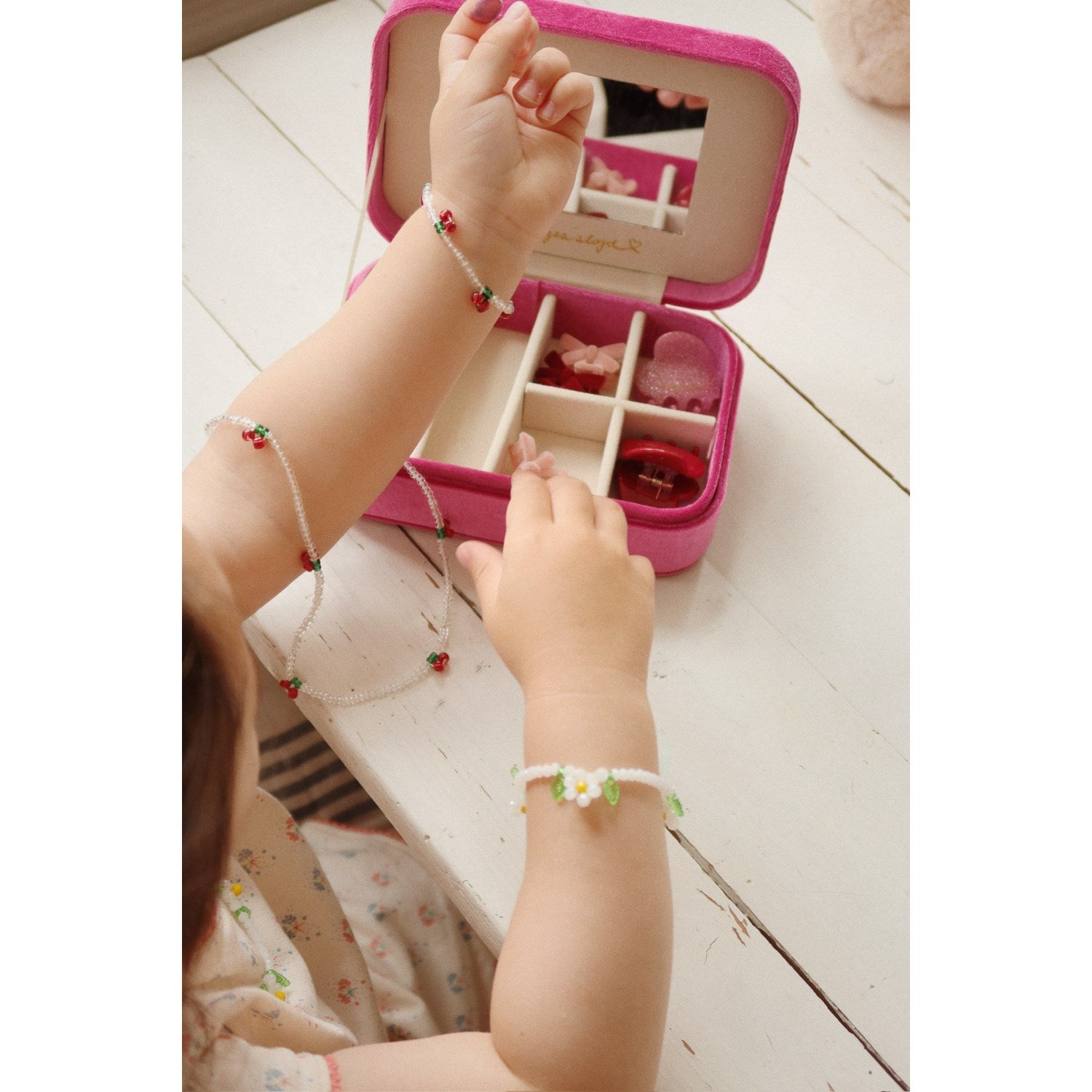 • Indeholder: kirsebærhalskæde, kirsebærarmbånd, blomsterhalskæde, blomsterarmbånd, 6 hårspænder