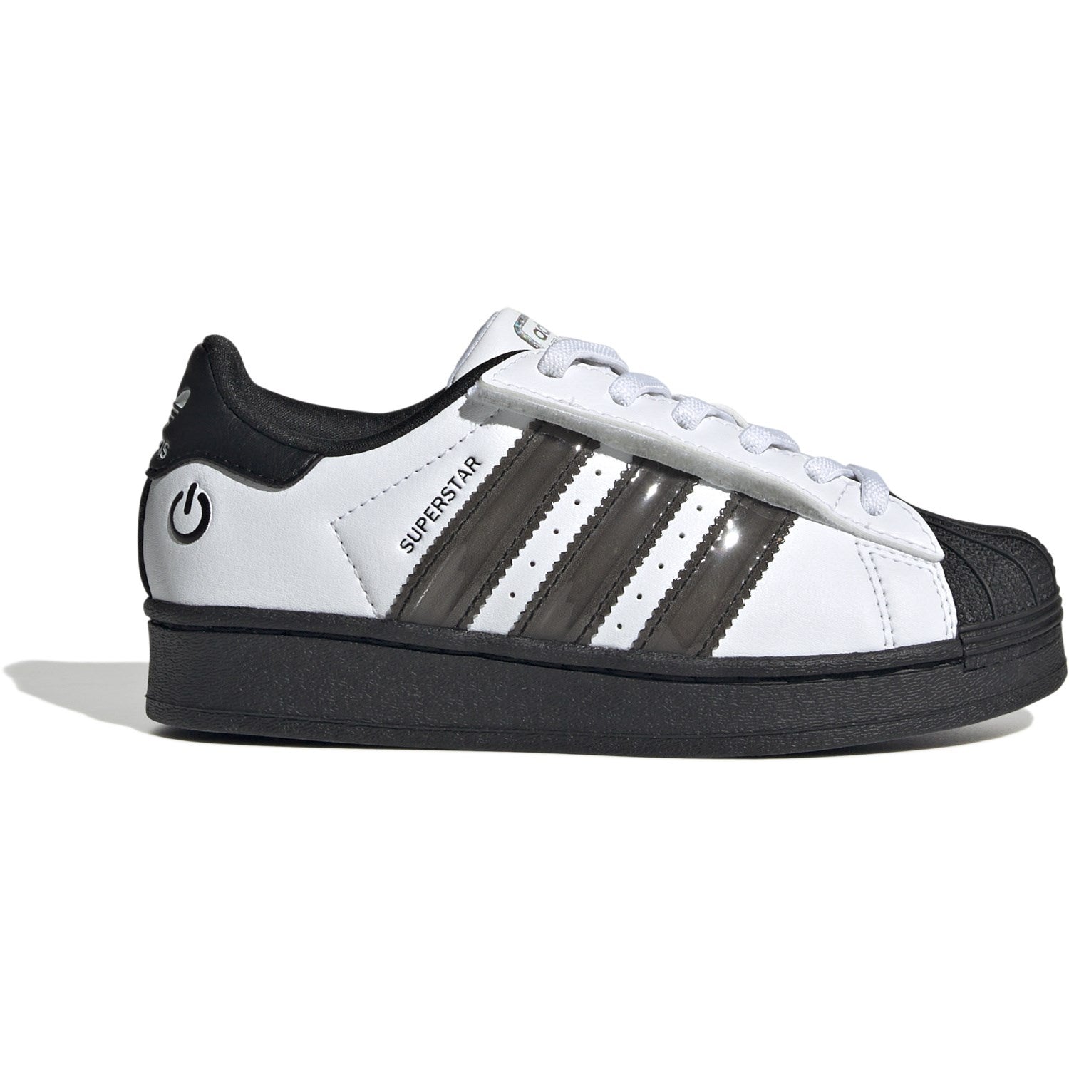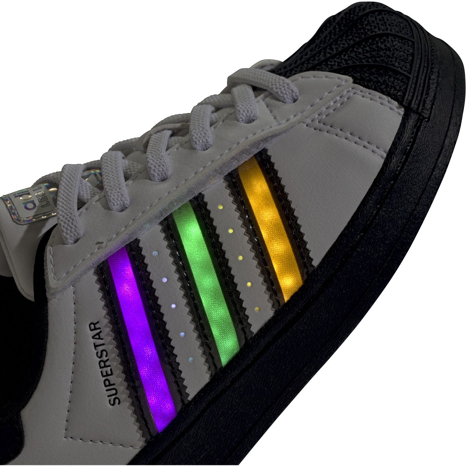 - Ekstra: 3 striper, Superstar-merke på siden, adidas-logo og LED-lyslogo på pløsetiketten, trekløver på hælfliken, av/på-knapp på siden