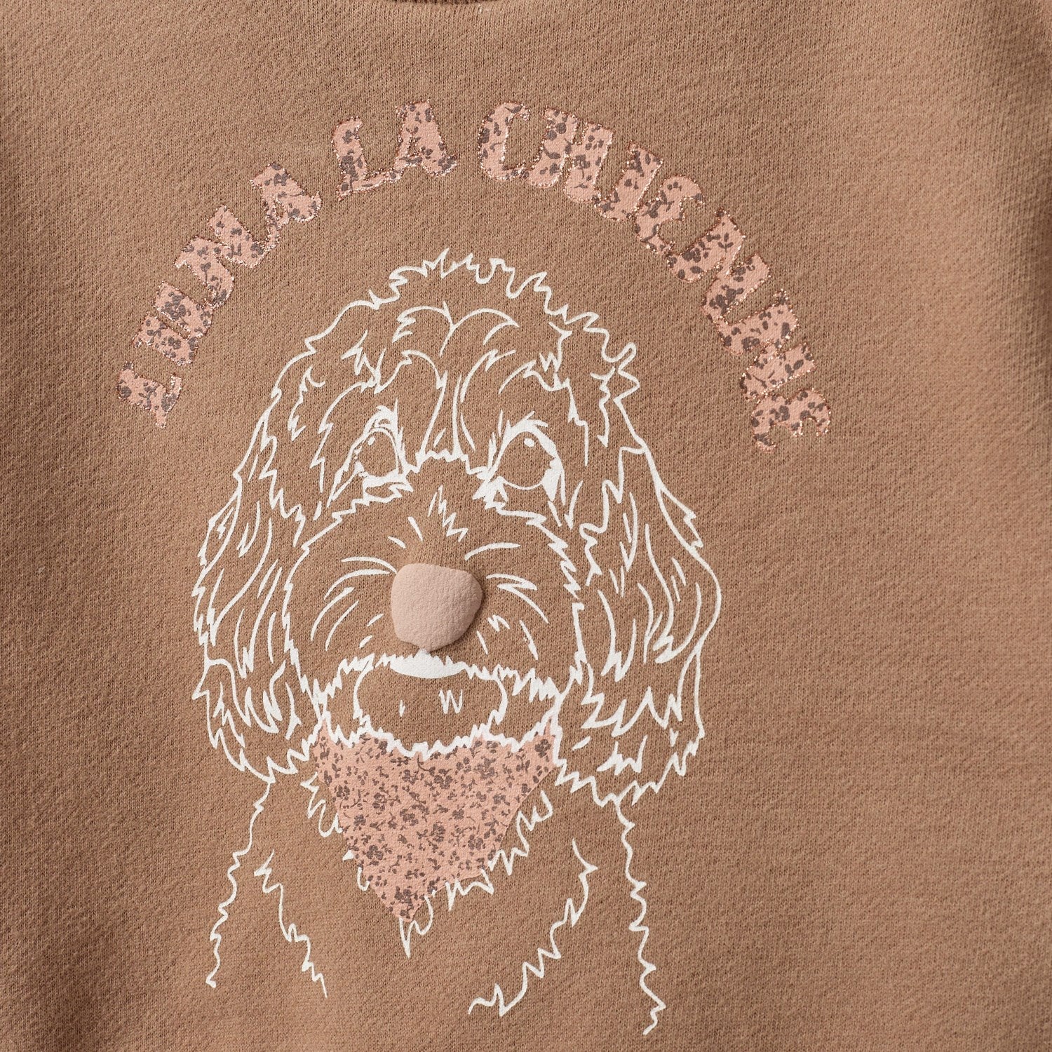 Opplev koselige eventyr i denne sjarmerende cashewnøttbrune genseren fra Sofie Schnoor. Denne genseren er designet med kjærlighet og omsorg, og er utsmykket med et søtt hundetrykk som vil bringe et smil til enhver liten oppdagelsesreisendes ansikt. Perfekt for kaldere dager og avslappende øyeblikk. Enkel å style og behagelig å ha på, denne genseren vil garantert bli en garderobefavoritt!
